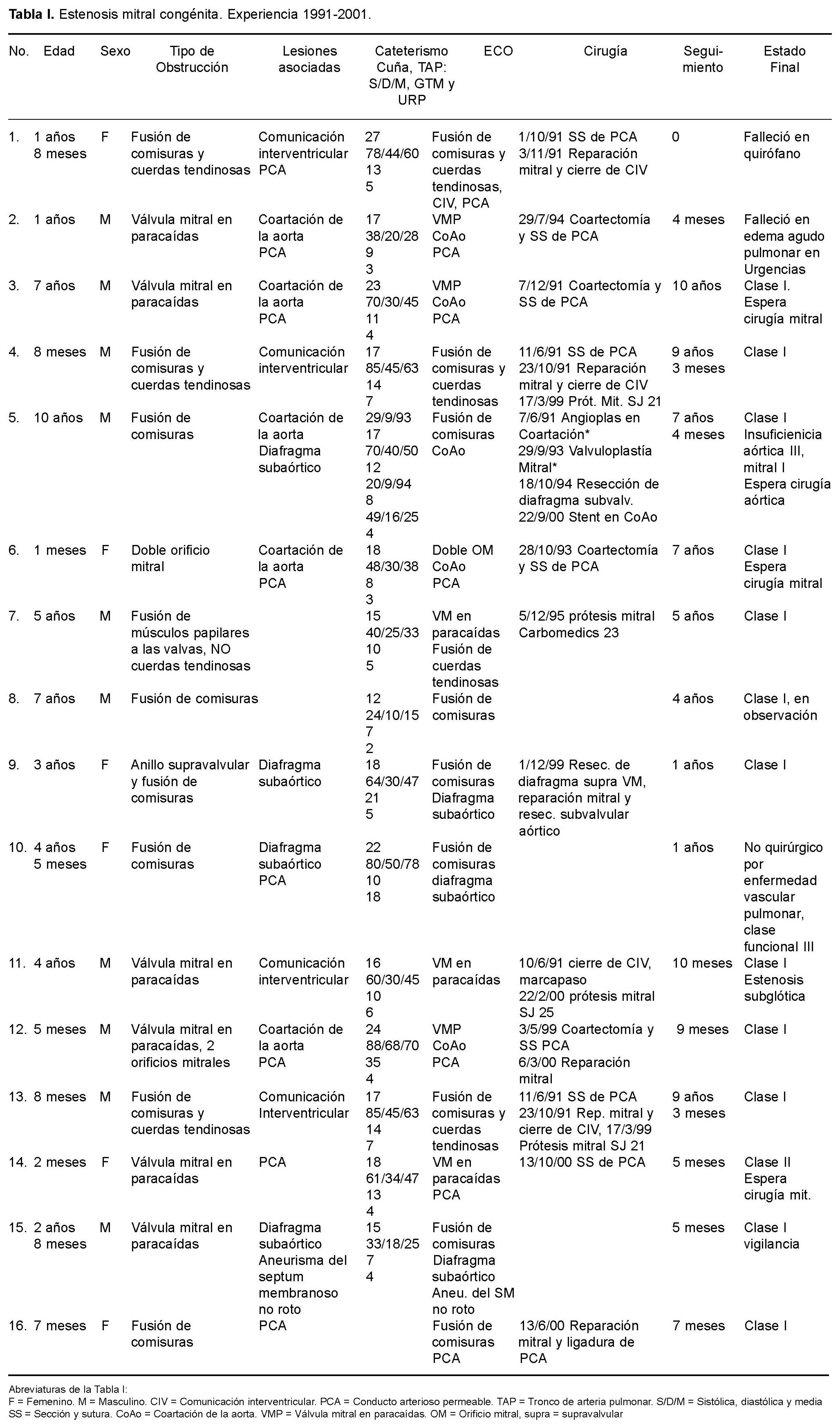 Reparación mitral quirúrgica. Se efectuó en 6 casos. En el enfermo con diafragma supravalvular mitral y fusión de comisuras (caso 9), la resección del diafragma se hizo al inicio en el borde posterior y terminó en el anterior, separando el diafragma de las valvas y cuidando no dañarlas, luego se efectuó la comisurotomía mitral. En los enfermos con fusión de comisuras y cuerdas tendinosas, (casos 1, 4, 13 y 16), se hizo la comisurotomía combinada con fenestración de las cuerdas y separación de músculos papilares para ampliar el espacio entre las cuerdas y la excursión de las valvas y se resecó el tejido redundante entre las cuerdas. Dos de estos casos, 8 años después requirieron prótesis mitral (casos 4 y 13) (Tabla I). En el enfermo con válvula mitral en paracaídas y doble orificio mitral (caso 12), el músculo papilar único fue separado mediante una incisión en dos: una porción posterior y otra anterior, las cuerdas tendinosas fueron fenestradas y el puente de tejido valvar que producía los dos orificios fue resecado. En combinación con la reparación mitral se cerró una comunicación interventricular en 3 casos, uno de los cuales falleció en la operación al inicio de esta serie (caso l). La implantación de prótesis mitral se llevó a cabo en 4 enfermos, en dos de ellos esto ocurrió 8 años después de la reparación mitral debido a insuficiencia mitral severa, en los otros dos el implante protésico fue primario. Uno de estos casos tenía fusión directa de los músculos papilares a las valvas mitrales, lo que impidió la reparación (caso 7) y en el otro enfermo, (caso 11) la evaluación intraoperatoria después de la comisurotomía valvular, separación de músculos papilares y fenestración de cuerdas, reveló inadecuada coaptación de las valvas provocando insuficiencia mitral importante por lo que se procedió al implante protésico. Las prótesis utilizadas fueron St. Jude 21, Carbomedics 23, St. Jude 25 y St. Jude 25 respectivamente (casos 4, 7, 11 y 13). La derivación cardiopulmonar (DCP) en las reparaciones mitrales fue de 128 ± 16 minutos y el pinzamiento aórtico de 45 ± 12, sin diferencia estadística con relación a los tiempos de implantación de prótesis mitral 118 ± 12 de DCP y 33 ± 11 minutos de pinzamiento aórtico. Los cuatro enfermos con prótesis reciben anticoagulación oral para mantener niveles de INR entre 2.5 y 3.5.