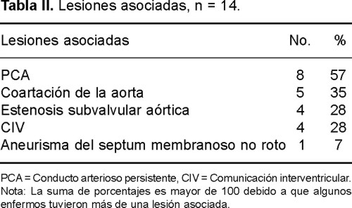 Lesiones asociadas. Se observaron lesiones asociadas en 14 enfermos (87%), las más frecuentes fueron el conducto arterioso persistente y la coartación de la aorta que se documentaron en el 57 y 35% de los casos (Tabla II).