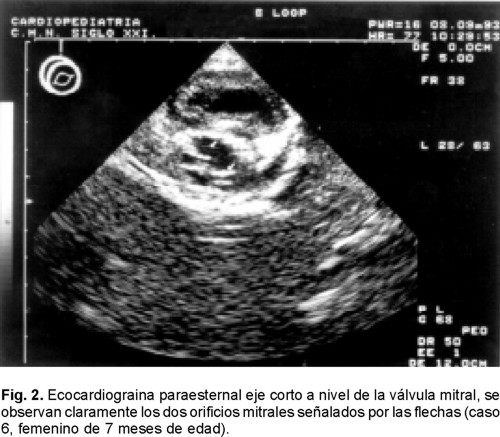 Se encontraron 16 enfermos en un periodo de 10 años (Tabla I). El rango de edad fue de 2 meses a 10 años, media de 3 ± 3.08 años. Diez enfermos fueron masculinos y 6 femeninos. En 7 de los 16 (43%) la obstrucción se debió a fusión de comisuras de las valvas y cuerdas tendinosas en presencia de dos músculos papilares (Fig. 1). En 6 (37%) se encontró válvula mitral en paracaídas, en un enfermo (6%) se documentó la presencia de anillo supravalvular mitral combinado con fusión de las comisuras valvulares, en otro caso se observó fusión directa de los músculos papilares con las valvas por ausencia de cuerdas tendinosas y uno más tenía doble orificio mitral con fusión de comisuras y cuerdas tendinosas (Fig. 2). En ningún enfermo se encontró el síndrome Shone completo, sin embargo, sólo en 2 (12.5%) se encontró la estenosis mitral como lesión aislada.