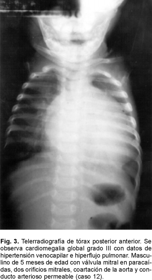 La telerradiografía de tórax mostró cardiomegalia III con datos de hipertensión venocapilar combinados con flujo pulmonar aumentado en 11 enfermos (68%), todos ellos tenían un cortocircuito de izquierda a derecha; dos enfermos (12.5%) con cardiomegalia III y datos de hipertensión venocapilar (Fig. 3), en un enfermo cardiomegalia III con flujo disminuido y cardiomegalia I en dos.