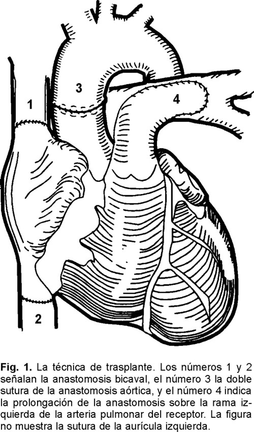 Simultáneamente se iniciaba la intervención en el receptor con la rutina habitual de la cirugía cardiaca. El corazón del receptor se encontró muy dilatado y al descender la temperatura fibriló y se detuvo espontáneamente. Se corroboró la hipoplasia del tronco de la arteria pulmonar que guardaba gruesamente una relación de 1 a 4 al compararse con la aorta; en tanto que las dos ramas de la arteria pulmonar aparentaban calibre adecuado, situación que después de hacer la cardiectomía, obligó a prolongar una incisión sobre cara anterior de la rama izquierda de la arteria pulmonar y de este modo se pudo preparar una boca anastomótica de dimensiones suficientes. Las venas cavas inferiores fueron preparadas para anastomosis bicaval. El corazón del donador fue suturado en la siguiente secuencia: (1) se hizo una sutura continua que aproximó la aurícula izquierda del donador al borde receptor de la pared posterior de la aurícula izquierda, que circundaba las desembocaduras de las venas pulmonares y había sido preparado para este propósito; (2) sutura continua y no estenosante de la vena cava inferior del donador con la igual del receptor; (3) sutura de la vena cava superior con su homóloga; (4) sutura de la arteria pulmonar y un colgajo de la rama izquierda de la arteria pulmonar del donador al lecho receptor pulmonar (Fig.1). Finalmente, (5)se hizo doble sutura continua para aproximar los dos cabos aórticos que habían sido tallados a la longitud e inclinación adecuadas. El procedimiento, se llevó a cabo en 49 minutos de pinzamiento aórtico, para un tiempo total de circulación extracorpórea de dos horas con cuarenta y dos minutos. El Departamento de Patología al examinar el corazón explantado lo registró con peso de 450 gramos (para un peso máximo esperado de 270 gramos) y la ausencia quirúrgica de la aorta ascendente con diámetro de 23 mm en la unión sinotubular (normal para la edad 18-21 mm), el tronco de la arteria pulmonar no fue mesurable por la mutilación quirúrgica pero se encontró diminuto, cuando a un corazón normal correspondería un diámetro de 21 milímetros;7,8 sólo se reportó el haber recibido los fragmentos de paredes vasculares con placas blandas de ateroma y sigmoideas calcificadas, hipoplasia del anillo e hipertrofia infundibular. Ausencia quirúrgica de la pared posterior de la aurícula izquierda y de la desembocadura de las venas pulmonares. El epicardio estaba liso y brillante con áreas blanquecinas difusas y moderada cantidad de tejido adiposo epicárdico. A la sección longitudinal se corroboró el origen biventricular de la aorta con cabalgamiento mayor del 50% y defecto septal ventricular subaórtico de diámetro similar al del anillo aórtico; se corroboró igualmente la hipertrofia del infundíbulo de la cámara de salida del ventrículo derecho. Se identificaron en el tabique zonas blancas mal delimitadas; en el miocardio restante, tanto del ventrículo izquierdo como del derecho se apreciaron cambios semejantes a los descritos en el tabique. Las arterias coronarias macroscópicamente no mostraron alteraciones y estaban permeables. El estudio histológico reveló signos de hipertrofia miocárdica, con zonas extensas de fibrosis en la pared libre de ambos ventrículos y en el tabique interventricular.