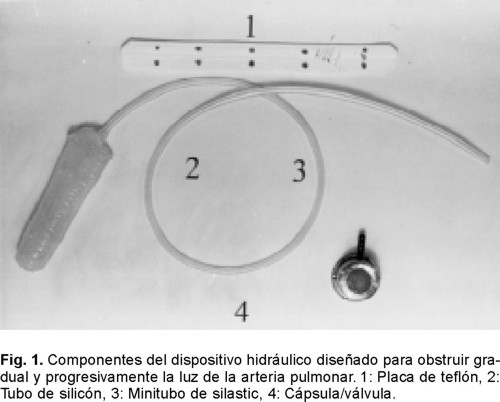 Dispositivo hidráulico para la oclusión del tronco de la arteria pulmonar. El dispositivo oclusor hidráulico utilizado en este trabajo, fue diseñado en nuestra institución para ocluir paulatinamente la luz del tronco de la arteria pulmonar de un perro, sin que se comprometa con ello la integridad del mismo. Las partes que integran al dispositivo hidráulico para la oclusión de la arteria pulmonar se listan enseguida y se ilustran en la Figura 1: