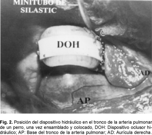 Cada una de las partes del dispositivo se elaboraron por separado y ya ensamblado, el DOH se coloca con relativa facilidad en el tronco de la arteria pulmonar del perro (Fig. 2). La cápsula/ válvula externa se fija subcutáneamente en la parte dorsal de la región torácica del cánido, dejando disponible la porción superior de la cápsula con el silastic para inyectar o quitar agua al obturador y con ello ocluir más o menos el tronco de la arteria pulmonar que circunda, lo que entonces incrementa o decrementa la presión sistólica del VD respectivamente.