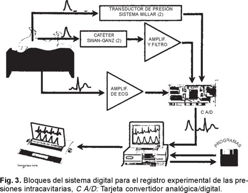 Sistema de adquisición de datos hemodinámicos. El sistema utilizado para la adquisición digital de las variables hemodinámicas que aquí se describe, diseñado y construido en nuestra institución, está integrado por una computadora personal a la que se le agregó, bajo diseño específico, una tarjeta para convertir las señales analógicas a digitales (C A/D) y la electrónica y la programación requeridas para adquirir en la PC el electrocardiograma (ECG) diferencial, dos registros de presión intracavitaria procedentes de dos transductores Millar y dos señales hemodinámicas obtenidas de un catéter Swan-Ganz (Fig. 3).