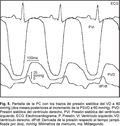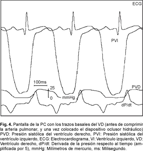 En la Figura 4 se muestra una imagen de la pantalla del monitor de la PC que contiene los trazos basales obtenidos una vez colocado el DOH y antes de comprimir el tronco de la arteria pulmonar, mientras que en la Figura 5 se muestra la pantalla de la PC con los trazos producidos luego de comprimir la arteria pulmonar, la presión obtenida es de 60 mmHg de presión sistólica del ventrículo derecho. En ambas figuras se presentan las curvas de presión del ventrículo derecho y las del izquierdo, además del ECG y de la dP/dt máxima positiva y negativa del ventrículo derecho. Los trazos de las dP/dt ventriculares se muestran amplificadas por cinco en la Figura 4, y en la Figura 5 los trazos de las dP/dt ventriculares se amplificaron por dos, para que se aprecie mejor, en ambas, su morfología.