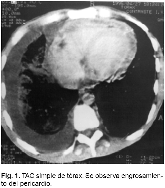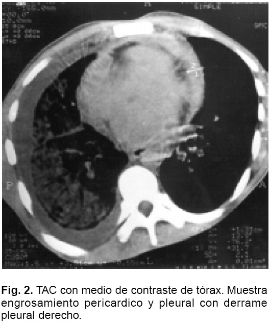 Un ecocardiograma mostró importante engrosamiento del pericardio, con derrame pericárdico de predominio posterior. La función ventricular izquierda discretamente reducida, con anormalidades del movimiento del septum interatrial e inter-ventricular. Mediante el registro Doppler se observaron variaciones respiratorias de la velocidad del flujo valvular pulmonar. Se realizó pericardiocentesis bajo visión ecocardiográfica drenando 400 cc de líquido serohemático. El análisis del líquido pericárdico reportó: proteínas de 6.3 mg/dl; glucosa 70 mg/dl; examen citológico en clase 1; BAAR negativo; cultivos para búsqueda de microorganismos aerobios, anaerobios y de hongos, todos fueron negativos. Una TAC de tórax demostró importante engrosamiento del pericardio, midiendo 1.3 cm de espesor (Figs. 1 y 2), derrame pleural derecho y engrosamiento pleural, así como infiltrado parenquimatoso basal derecho (Fig. 3). Habiá deformidad en cuña de los segmentos vertebrales de T12-L1, L1-L2 y L2-L3, con disminución del espacio y alteraciones del disco; las superficies articulares irregulares con zonas de destrucción ósea. En base a los hallazgos tomográficos se formuló el diagnóstico de probable coccidioidomicosis diseminada. Sin embargo, la prueba de intradermorreacción a la coccidioidina fue negativa. Se inició tratamiento con antifímicos (isoniazida, pirazinamida, rifampicina) y anfotericina B.