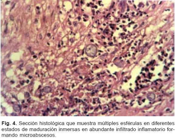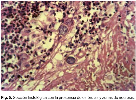 Su condición clínica se deterioró 36 horas después con disnea severa e hipotensión arterial. Se realizó pericardiectomía urgente, a través de una incisión submamaria izquierda, observando una movilidad cardiaca muy restringida y un pericardio engrosado (2 cm), duro e irregular de color grisáceo, completamente adherido al miocardio del ventrículo derecho y ventrículo izquierdo. Se resecó el pericardio. La biopsia consistió en múltiples fragmentos de aspecto fibroso, friables, de superficie irregular con focos de necrosis. El examen microscópico reveló fibrosis con engrosamiento del pericardio, con predominante reacción granulomatosa constituida por células epitelioides, células gigantes multinucleadas, linfocitos y polimorfonucleares, formando en algunas zonas microabscesos con extensas zonas de necrosis. Se identificaron además numerosas esférulas de Coccidioides immitis (Figs. 4, 5 y 6).
