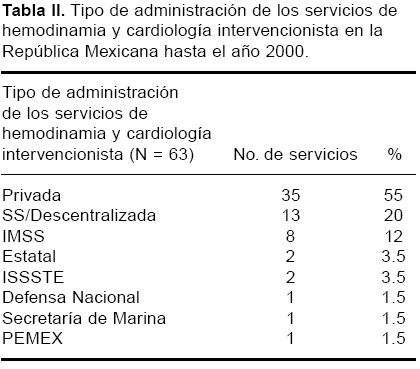 Características de los departamentos: de los 39 servicios reportados, el 100% cuenta con disponibilidad de cirugía cardiotorácica y apoyo anestésico en sala, el 94% tiene capacidad para la atención de casos de urgencias, pero sólo el 70% posee un programa de corta estancia y disponibilidad de 24 horas (Tabla I). El tipo de administración demuestra claramente un predominio en la iniciativa privada (55%), seguidos por la Secretaría de Salud y el Instituto Mexicano del Seguro Social, quedando detrás el ISSSTE, la SEDENA, la Secretaría de Marina y PEMEX (Tabla II).
