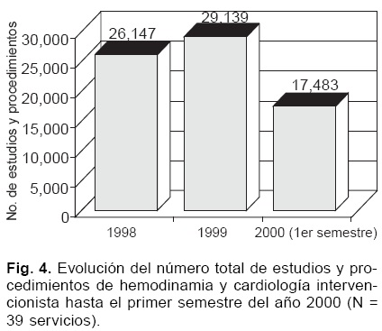 Número y tipo de procedimientos: se recabaron el total de procedimientos realizados en 1998, 1999 y el primer semestre del año 2000 (Fig. 4). En 1998 se llevaron a cabo 26,147 estudios, de los cuales 15,923 correspondieron a estudios coronarios diagnósticos con 3,000 intervenciones coronarias percutáneas en adultos, en 1999 se realizaron 29,139 con 17,461 estudios diagnósticos y 4,000 intervenciones coronarias percutáneas en adultos y en el primer semestre del 2000 17,483 estudios, de los cuales 10,100 correspondieron a diagnósticos coronarios y 2,689 intervenciones coronarias en adultos. De acuerdo con estos datos, el intervencionismo coronario es responsable del 19% del total de procedimientos realizados.