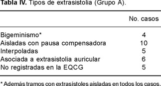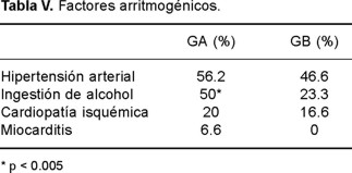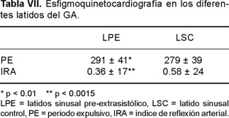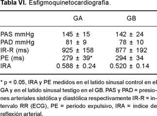 Las características demográficas del GA y del GB se ven en la Tabla III. No se encontraron diferencias en: edad, peso, talla, sexo y presión arterial. En la Tabla IV se mencionan los tipo de extrasistolia del GA. Los factores arritmogénicos en los dos grupos no fueron diferentes (Tabla V) con excepción de la ingestión de alcohol de carácter moderado (≥ 60 c.c. de licor > 40%ºL diario) y la cual prevaleció en el GA. Esfigmoquinetocardiografía (Tabla VI): el intervalo R-R, y el índice de reflexión arterial entre los grupos A y B medidos en los latidos control vs el promedio de 3 latidos testigo respectivamente, no mostraron variantes estadísticamente significativas con excepción de un periodo expulsivo menor en el GA. Siete casos del grupo A no tuvieron rebotes carotídeos precoces: en 6 de ellos se encontró un factor arritmogénico tradicional (4 casos con alcoholismo y 2 con miocarditis). En 3 casos con rebote carotídeo precoz no se encontró HA ni datos de arteriopatía. En el grupo A el latido sinusal pre-extrasistólico (Tabla VII) tuvo un PE (en ms) más largo (291 ± 41 vs 279 ± 39, p = 0.01) y un índice de reflexión arterial menor (0.36 ± 0.17 vs 0.58 ± 0.24, p = 0.0015) que el latido sinusal control. El substrato arritmogénico de tipo ventricular fue más frecuente en el GA (60%) que en el GB (33.3%), aunque el dato no fue significativo (p > 0.43). El substrato carotídeo fue marginalmente significativo entre ambos grupos: GA = 70% y GB = 46.6, p < 0.07.