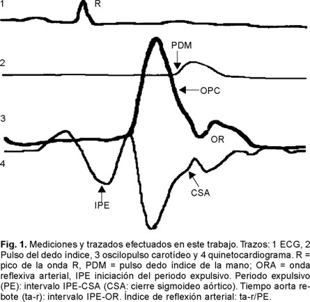 Mediciones y criterios. Las señales se imprimieron en papel milimétrico y asistidos por la temporalidad del registro del electrocardiograma, del fotopulso del dedo índice y del oscilopulso carotídeo, se efectuaron las siguientes mediciones: a) intervalo R-R (DII) (tiempo de onda R a onda R del ECG), b) periodo expulsivo (PE): inicio del periodo expulsivo (IPE) hasta el cierre sigmoideo aórtico (CSA) determinado por la muesca en la rama ascendente de la deflexión ventricular (Fig. 1),13 c) tiempo aorta-rebote (ta-r) o sea, el intervalo inicio del periodo expulsivo ventricular-frente de onda de la reflexión en el oscilopulso carotídeo (Fig. 1) y d) índice de reflexión arterial (IRA): ta-r/PE.14