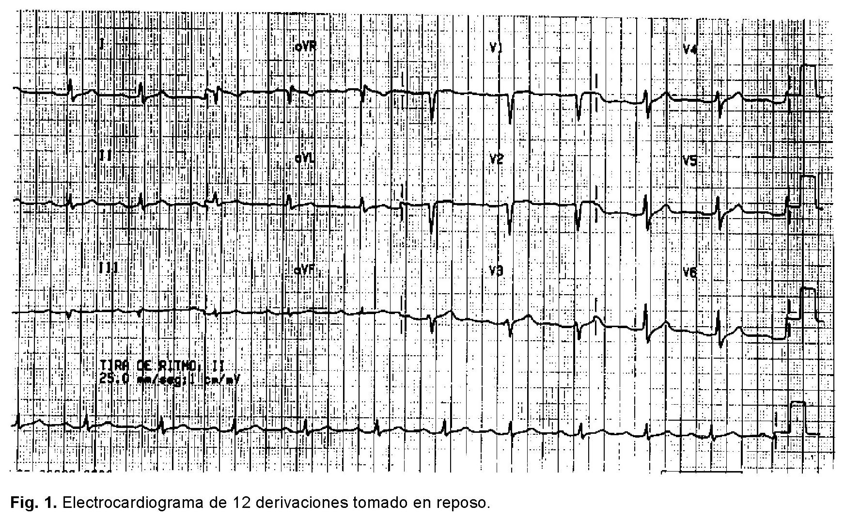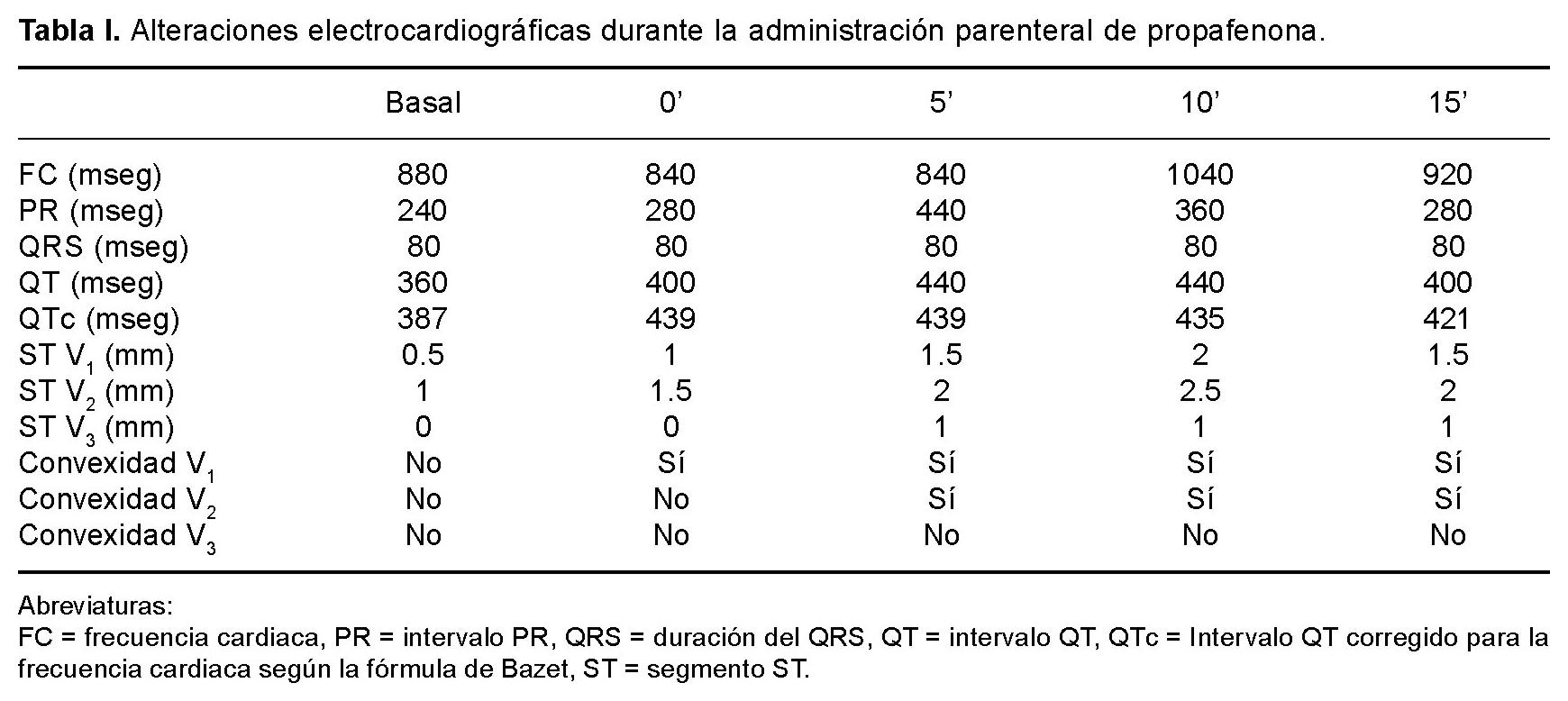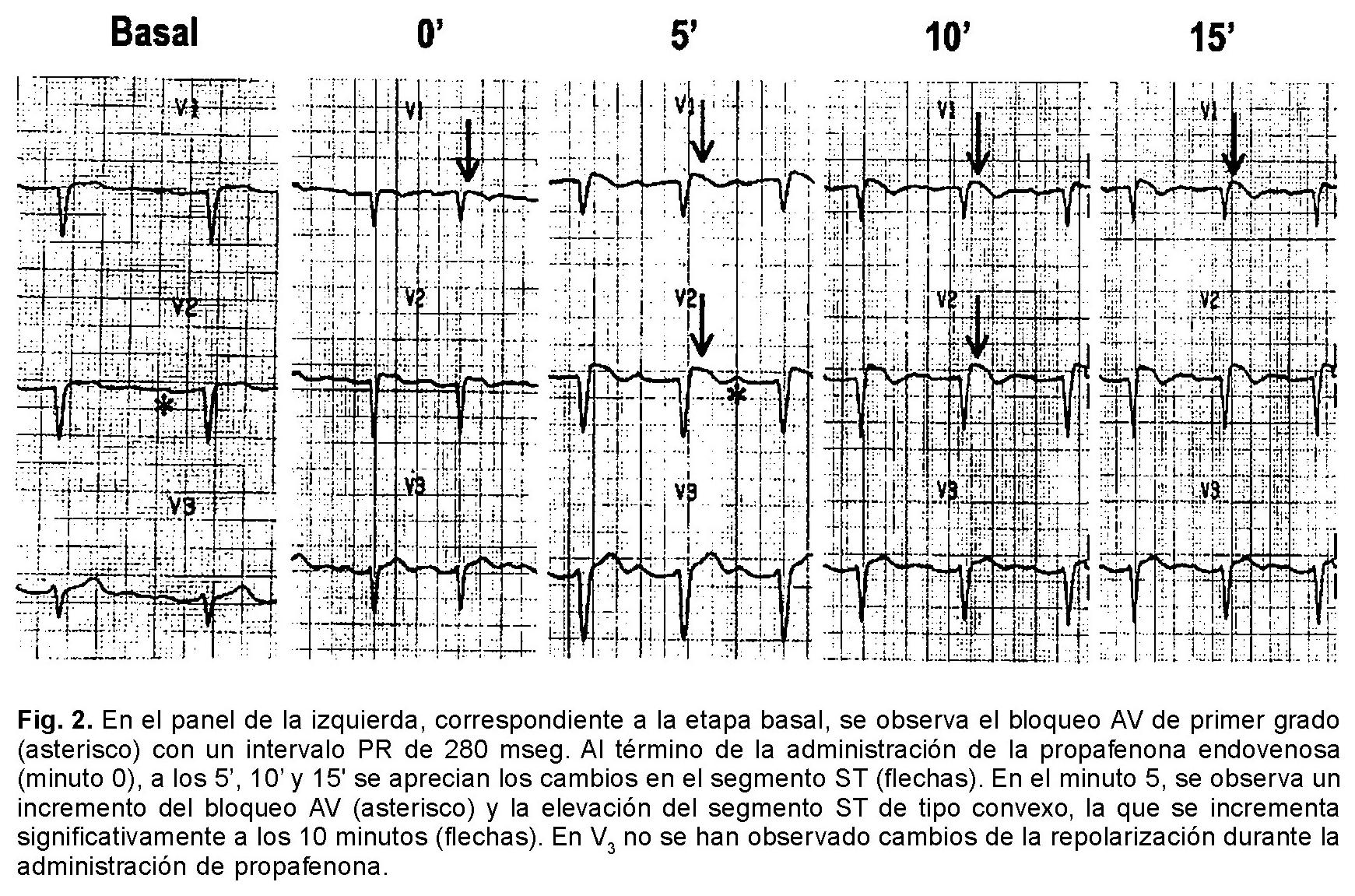 Mujer de 39 años de edad con antecedentes familiares de muerte súbita en un hermano varón y otro con "síndrome de Brugada". No tenía episodios de síncope, ni palpitaciones. El electrocardiograma de 12 derivaciones (Fig. 1) mostraba ritmo sinusal con una frecuencia de 75 lpm, un bloqueo AV de primer grado (intervalo PR 280 mseg). El ÂQRSF se situaba a + 60 grados y la duración del QRS fue de 0.08 seg, el segmento ST de V1 a V3 no estaba elevado. Una radiografía de tórax y el ecocadiograma transtorácico modo M, bidimensional y el Doppler codificado color no detectaron alteraciones estructurales. La prueba de tolerancia al ejercicio no mostró cambios electrocardiográficos durante el esfuerzo ni en la fase de postesfuerzo. Ante los antecedentes familiares, se decidió realizar una prueba farmacológica con propafenona endovenosa, dada la poca disponibilidad de los fármacos sugeridos para desenmascararlo (ajmalina, flecainida y procainamida) y por sus similitudes electrofisiológicas sobre el bloqueo de los canales de sodio, se utilizó propafenona parenteral, dosis única de 2 mg/kg administrados durante tres minutos, con monitoreo electrocardiográfico continuo, toma de presión arterial y determinación de la frecuencia cardiaca inmediatamente al termino de la administración de propafenona, que denominamos minuto 0, y cada 5 minutos durante los primero 30 minutos y posteriormente a la hora. Los cambios electrocardiográficos durante la administración de la propafenona se muestran en la Tabla I. La prueba farmacológica fue positiva, ya que causó elevación del segmento ST de tipo convexo en V1 y V2 mayor de 1.5 mm, e incrementándose a los 10 minutos (Fig. 2). La presión arterial se mantuvo sin alteración. Posteriormente se realizó un estudio electrofisiológico, donde el bloqueo AV de primer grado era infrahisiano (HV = 70 mseg). Mediante estimulación programada con la aplicación de un ciclo básico V1-V1 de 400 mseg y la aplicación de uno, dos y hasta tres extraestímulos en el ápex y el tracto de salida del ventrículo derecho, no se desencadenaron episodios de taquicardia ventricular ni fibrilación ventricular. Después de un seguimiento de 10 meses en promedio, no ha presentado sintomatología relacionada a taquiarritmias. Sin embargo, dada la naturaleza tan cambiante de este síndrome, sigue en vigilancia continua.