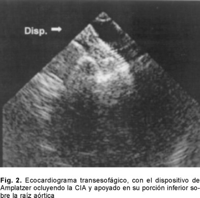 De los 3 pacientes tratados por la vía percutánea para cierre de CIA dos mostraron oclusión inmediata del 100% determinado por ecocardiografía Doppler-color durante el estudio transesofágico. El paciente de 12 años presentó fuga trivial inmediata, que desapareció en el estudio ecocardiográfico de control realizado 24 horas después del cierre. No se presentaron complicaciones durante el procedimiento. Los 3 pacientes fueron egresados del hospital 48 horas después del implante con tratamiento a base de aspirina 175 mg cada 24 horas. El ecocardiograma transtorácico practicado al mes de seguimiento reportó oclusión del 100% en los 3 pacientes sin afectación de las estructuras vecinas como las válvulas atrio ventriculares (a-v), el seno coronario, las venas pulmonares y la vena cava superior. El tiempo promedio del procedimiento fue de 42 min y con un tiempo de fluoroscopía de también promedio de 12 min.