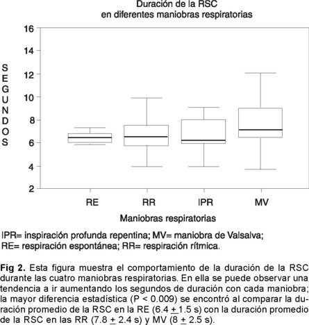 La Tabla I muestra que la RSC estuvo presente de forma aparentemente espontánea y al azar en poco más de la mitad (57%) de los 30 sujetos sometidos al estudio durante la RE; estuvo presente en alrededor del 97 por ciento de los sujetos durante la RR, y estuvo siempre presente (100%) tanto en la IPR como en la MV. Al comparar la latencia de la RSC mediante la prueba de ANOVA se encontró una diferencia estadísticamente significativa (P < 0.001) entre las 4 maniobras y mediante prueba de Tukey la diferencia estadística (P < 0.050), se observó entre la latencia de la RSC durante la RE (1.7 ± 0.7 seg) vs la latencia de la RSC promedio en la IPR (0.7 ± 0.5 seg) y MV (0.8 ± 0.9 seg). Mediante ANOVA también observamos diferencia estadística (P = 0.009) al comparar la duración de la RSC entre las cuatro maniobras y mediante prueba de Tukey la principal diferencia (p < 0.050) fue entre el valor promedio de la duración de la RSC de la RE (1.7 ± 0.7 seg) vs la duración promedio de la RSC de la IPR (7.8 ± 2.4 seg) y la duración promedio de la MV (8 + 2.5 seg). Las Figuras 1 y 2 muestran de forma más clara estas diferencias. Como podemos observar, la mayor significancia estadística se encontró entre las IPR y la MV por lo que decidimos analizarlas de forma más específica. En la Tabla III se analizan tanto la IPR como la MV; al comparar mediante t-Student el FSP previo a ambas maniobras (IPR = 151.3 ± 19.5 mV; MV = 156 + 24 mV) no se encontró diferencia estadísticamente significativa (P > 0.050). Sin embargo, en la misma tabla se observa la diferencia estadísticamente (P < 0.001) entre los valores de FSP a la máxima disminución registradas entre las cuatro MR (RE = 121.4 ± 34 mV; RR = 74.8 + 31.8 mV; IPR = 62.2 ± 21 mV; MV = 42.6 ± 16.5 mV ), la mayor diferencia se encontró al comparar los valores de esta variable entre la RE vs IPR y MV (P < 0.001). El porcentaje de disminución de FSP durante la RE fue de 35%; para la RR de 56%; para IPR fue de 60% y para MV de 73% (P < 0.001). La Tabla IV muestra que al comparar el latido de máxima disminución de FSP de la IPR [latido 8 (9-12)] vs latido de máxima disminución de FSP de la MV [latido 14 (9-20)] (tomando en cuenta como "latido 1" al que ocurre al inicio de la maniobra) se encontró una diferencia estadísticamente significativa (P < 0.001). Esta diferencia también se encontró al comparar el latido de recuperación al final de la IPR [latido 17 (11-20)] vs latido de recuperación al final de la MV [latido 6 (3-9)] (P < 0.001). El índice de Valsalva calculado en todos los sujetos fue de 1.8 + 0.3 en promedio. La Figura 3 muestra que la RSC puede o no aparecer de forma espontánea y al azar; en este caso elegimos una muestra de un sujeto en el cual la RSC no aparece de forma espontánea, fenómeno que como ya mencionamos se presentó 43 por ciento. La Figura 4 muestra la presencia de la RSC al final de la inspiración. El FSP disminuye con la inspiración y aumenta con la espiración. La Figura 5 muestra la latencia de la RSC con la inspiración profunda repentina así como la disminución brusca del FSP durante la misma maniobra. La Figura 6 muestra la disminución intensa del FSP durante la fase II y III de la maniobra y el aumento del flujo durante la fase IV.