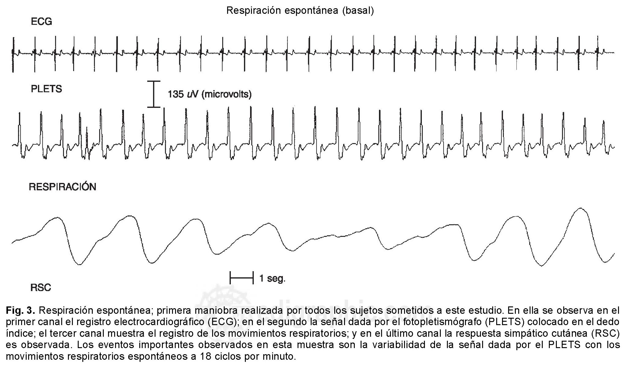 Objetivo: Estandarizar el método de variabilidad del FSP y la RSC en sujetos sanos durante cuatro maniobras respiratorias (MR): 1) respiración espontánea (RE); 2) respiración rítmica (RR) a una frecuencia de 6 por minuto; 3) inspiración profunda repentina (IPR); 4) Maniobra de Valsalva (MV).