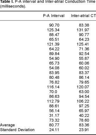 Results: P-A interval was slightly longer than IACT (83.36 ± 23.91 vs 80.77 ± 24.11 msec; p = 0.042), but a very good correlation was found between both measurements (r2 = 0.94).