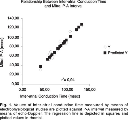Inter-atrial conduction time (IACT) is the interval elapsed between the initiation of atrial depolarization in the vicinity of the sinus node and the depolarization of the low lateral aspect of the left atrium.1 IACT can be measured with electrodes inserted into the heart and positioned at the high right atrium near the superior vena cava (sinus node region) and the inferior and lateral aspect of the left atrium.1 IACT has been shown to be prolonged by the action of drugs and therapeutic interventions, and in several heart diseases,2-7 but the possible applications of this finding have not been sufficiently investigated probably because IACT recording requires an expensive and invasive electrophysiological study. Atrial depolarization produces the P wave in the ECG and is followed by mechanical activation and atrial contraction. Atrial contraction in turn induces an increase in left ventricular filling velocity. In the case of the left atrium, this increase can be detected by the appearance of the A wave in the echo-Doppler signal of the mitral valve. The interval elapsed between the beginning of the P wave in the ECG and the initiation of the A mitral wave in the echo-Doppler signal (P-A interval) could be used as an estimate of IACT. Indeed, Wang et al measured that interval in the mitral echo-Doppler signal as an estimate of IACT in normal patients and in patients who had an implanted DDD pacemaker.8 They found significant differences in the two groups of patients, but they did not validate the echocardiographic measurement against the gold standard, i.e., the IACT measured during the electrophysiological study. This validation is the very purpose of the present research, the hypothesis of which is that there is a good correlation between IACT and the P-A interval measured in the echo-Doppler signal.