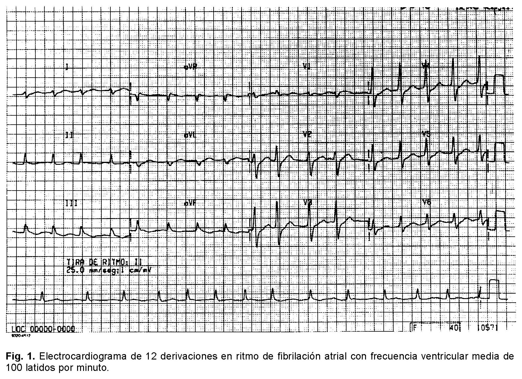 Paciente de sexo masculino de 68 años de edad con antecedente de tabaquismo y etilismo crónicos moderados. Su padecimiento inició seis meses antes de que acudiera a nuestra Institución y se manifestó por mareo y palpitaciones, por lo que se le realizó una valoración médica encontrando FA en el electrocardiograma de superficie; fue referido entonces a nuestro Hospital en donde se descartó la existencia de cardiopatía estructural. El estudio de gammagrafía cardíaca y una prueba de esfuerzo máxima fueron negativas para isquemia miocárdica. El ecocardiograma transtorácico mostró cavidades de diámetros, grosores parietales y movilidad normales; la fracción de expulsión se calculó en 65% y se descartó la existencia de trombos intracavitarios. Se inició tratamiento antiarrítmico con sotalol y posteriormente amiodarona sin conseguir la cardioversión farmacológica por lo que fue sometido a cardioversión externa; este procedimiento fue exitoso con una descarga de 360 J después de una descarga inicial de 200 J fallida. Se obtuvo ritmo sinusal con bloqueo atrioventricular de primer grado, y se mantuvo en tratamiento con pro-pafenona a una dosis de 150 mg cada 8 horas para prevenir la recurrencia, sin embargo, una semana después de la cardioversión el paciente inició nuevamente con la sintomatología que se había relacionado a la FA documentando en el electrocardiograma la recurrencia de la arritmia (Fig. 1). Se continuó tratamiento entonces con flecainida y anticoagulación oral con acenocumarina y más adelante se decidió la realización de cardioversión interna. El paciente continuó el tratamiento antiarrítmico con flecainida a una dosis de 100 mg cada 12 horas y se agregó diltiazem a una dosis de 30 mg cada 12 horas tres días antes del procedimiento de cardioversión interna.