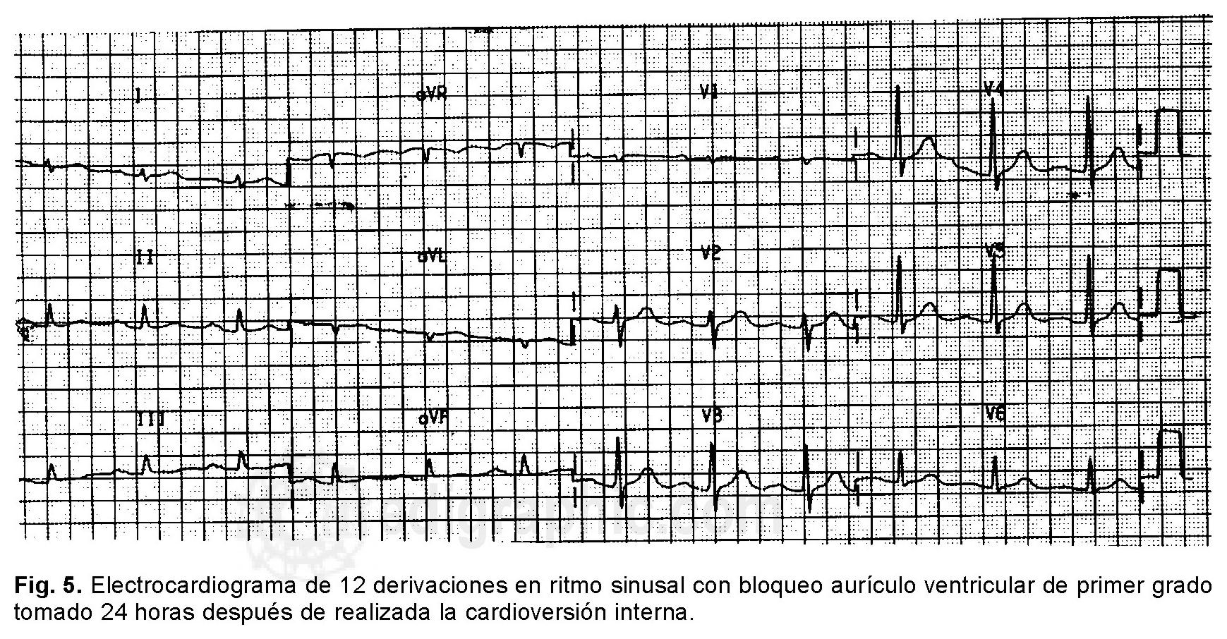 Mediante un dispositivo de cardioversión externa de onda bifásica conectado a una caja de transferencia se aplicó una primera descarga de onda bifásica de 1 Joule sin éxito; cinco minutos después una segunda descarga de 3 Joules del mismo tipo de energía tampoco fue exitosa. La tercera descarga de 5 Joules pudo convertir a ritmo sinusal que se inició después de una pausa de 4 segundos, observando bloqueo atrioventricular de primer grado suprahisiano (Fig. 4). El estudio de la función sinusal mostró incremento de los tiempos de conducción sinoatrial y de recuperación del nodo sinusal. La conducción aurículo ventricular fue normal y se descartó la presencia de vías accesorias o doble vía intranodal. Después de esto se dio por terminado el procedimiento sin complicaciones. Un electrocardiograma de control tomado 24 horas después del procedimiento, mostró ritmo sinusal con bloqueo atrioventricular de primer grado sin otras alteraciones y el ecocardiograma transtorácico fue normal (Fig. 5).