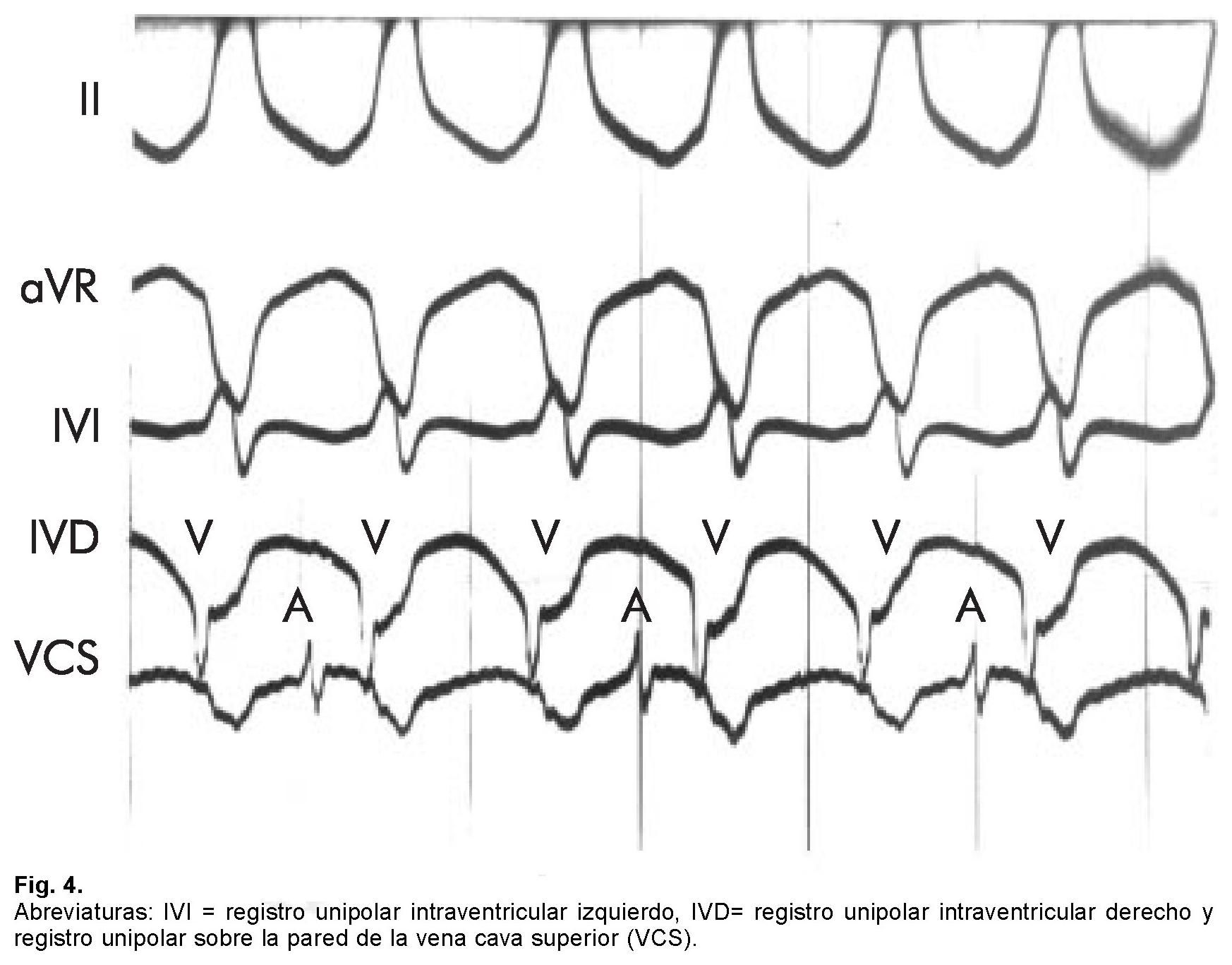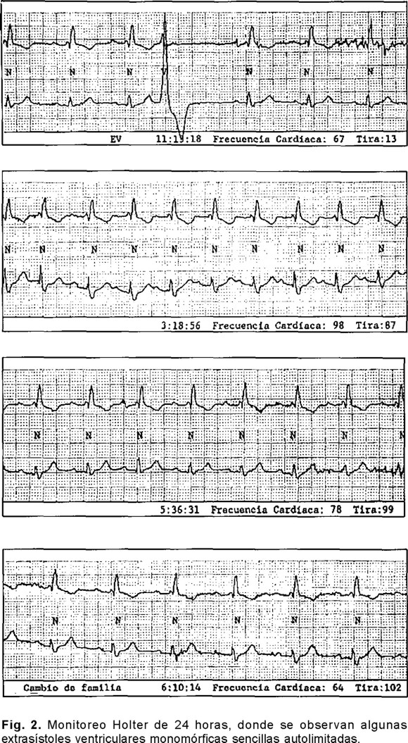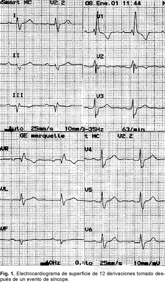 Presentamos el caso de un varón de 66 años de edad que no tenía antecedentes de importancia para su padecimiento actual, con historia de síncope sin pródromos hasta en tres ocasiones durante los últimos dos meses. Su electrocardiograma de 12 derivaciones después del síncope mostraba ritmo sinusal con una frecuencia de 63 lpm, el ÂQRSF se situaba a 30°, el intervalo PR era de 0.24 seg; en DI y aVL se observaban complejos qRS, rS en DII, rSr' en DIII y aVF, en V1 tenía rsR (Fig. 1). El Holter de 24 horas mostró ritmo sinusal, bloqueo AV de primer grado y algunas extrasístoles ventriculares aisladas monomórficas sencillas (Fig. 2). La prueba de esfuerzo no detectó alteración alguna y la prueba del masaje del seno carotídeo fue negativa. El ecocardiograma transtorácico mostró solamente hipertrofia concéntrica del ventrículo izquierdo con función ventricular del 57%. Se realizó una prueba de inclinación, que fue negativa para síncope neurocardiogénico en la etapa basal y al reto farmacológico con isosorbide. Ante la sospecha de probable taquiarritmia o bradiarritmia como causa de síncope, se realizó un estudio electrofisiológico.