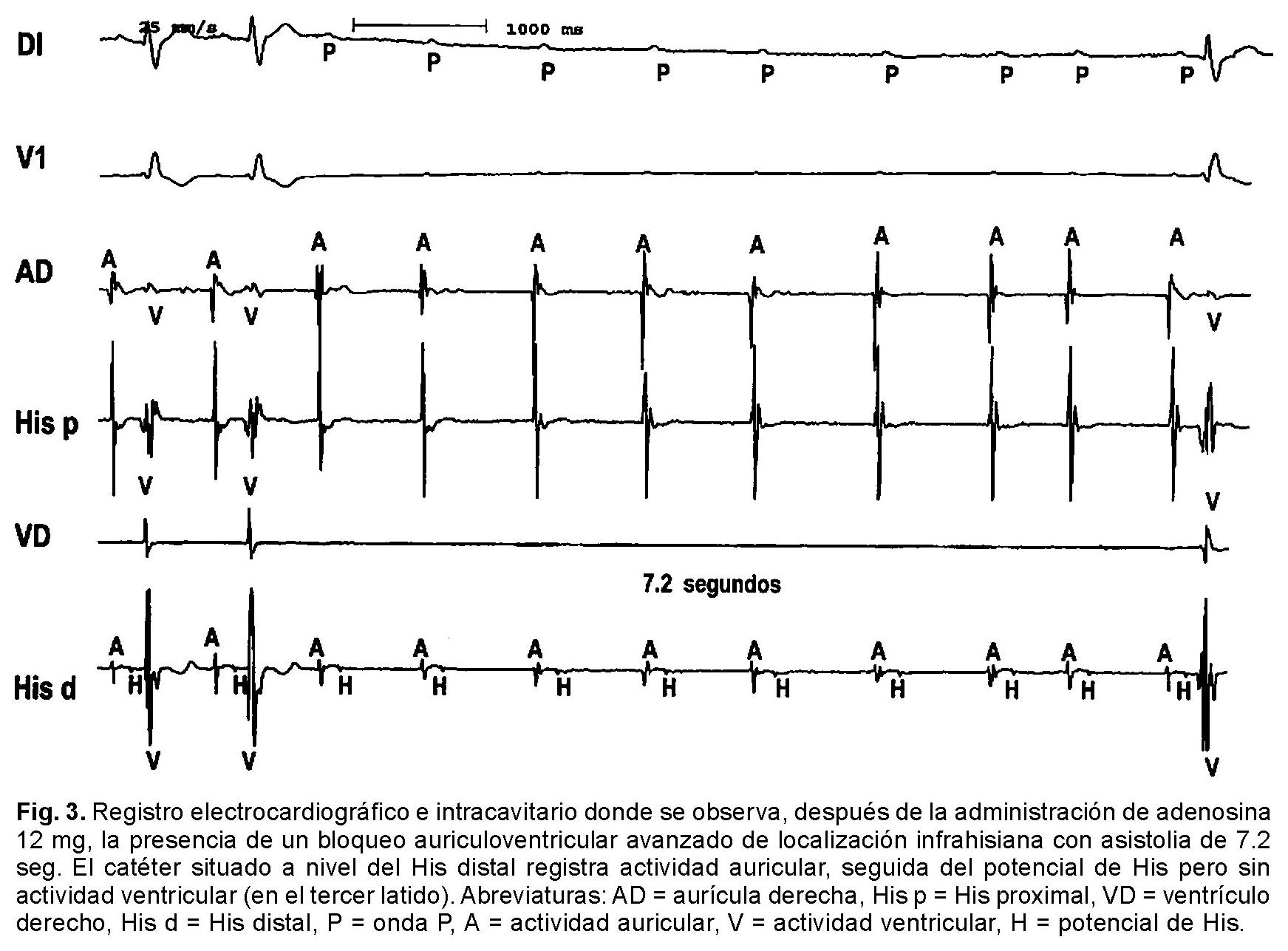 Por vía inguinal derecha con técnica de Seldinger modificada, se colocaron en vena femoral derecha tres electrocatéteres tetrapolares tipo Josephson para registro y estimulación de aurícula derecha, haz de His y ápex del ventrículo derecho. Los intervalos de conducción basales fueron PA = 40 mseg, AH = 120 mseg, y HV= 43 mseg. Con estimulación auricular decremental, el Wenckebach anterógrado se situó a 500 mseg, el tiempo de recuperación y la conducción senoauricular fueron normales. Mediante estimulación programada con la aplicación de un ciclo básico V1-V1 de 400 mseg y la aplicación de uno, dos y hasta tres extra-estímulos ventriculares en el ápex y el tracto de salida del ventrículo derecho, no se desencadenaron episodios de taquiarritmias ventriculares. Por último se administraron 12 mg de adenosina (Krenosin-sanofi~synthelabo) en bolo directo en vena antecubital izquierda, seguida de una carga de solución fisiológica 50 cc. Durante su administración el paciente presentó sensación de rubor; hipotensión arterial (80/60 mmHg) y se observó bloqueo AV avanzado súbito, de localización infrahisiana, con asistolia ventricular de 7.2 seg, seguido del restablecimiento espontáneo de la conducción AV (Fig. 3). Con estos resultados se decidió colocar al paciente un marcapaso endocárdico permanente.