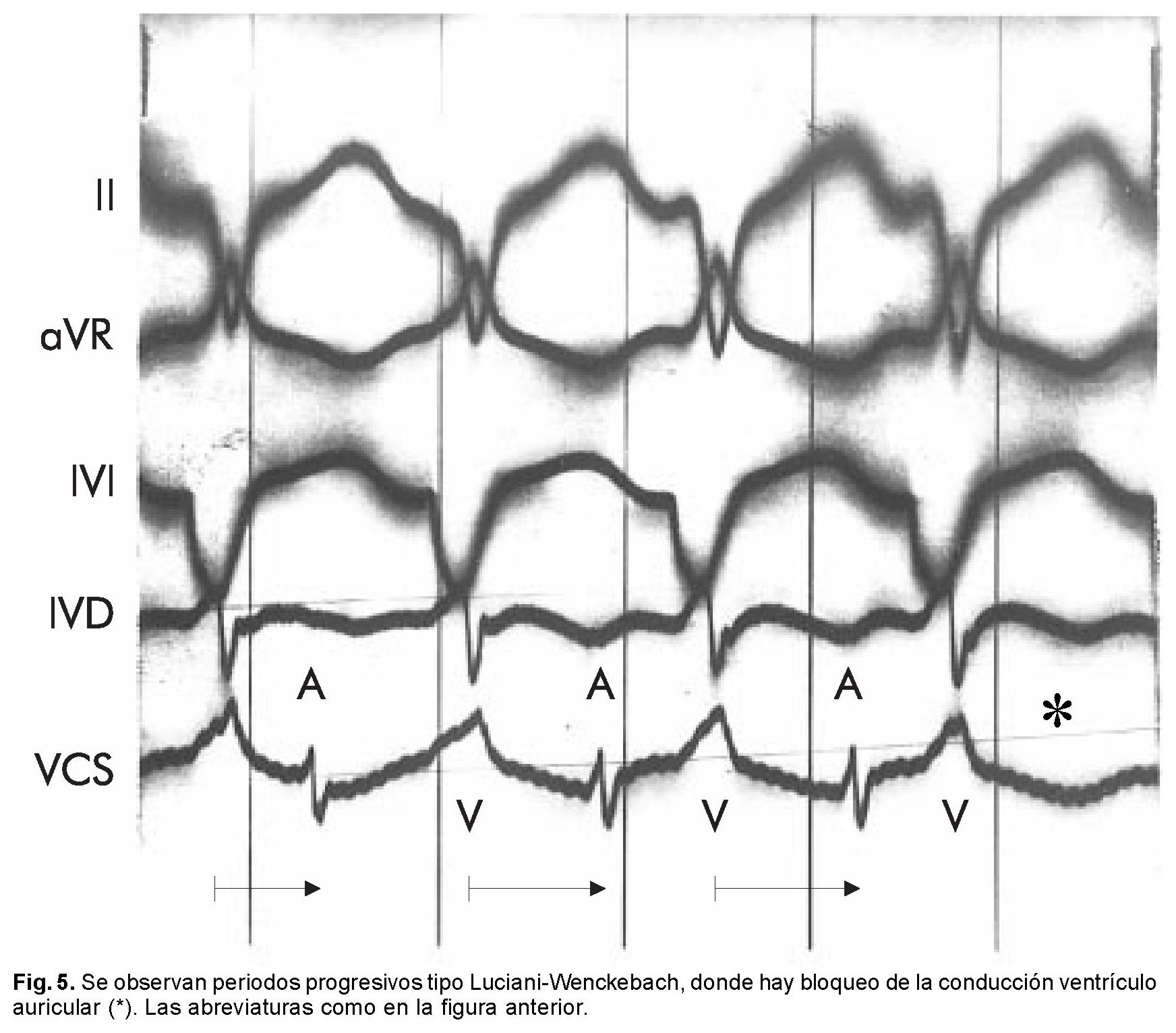 La adenosina en el corazón, además de ocasionar vasodilatación coronaria, deprime la actividad del nodo sinusal y del nodo AV, la contractilidad auricular y el automatismo ventricular.3 Su utilidad como fármaco antiarrítmico para la supresión de episodios de taquiarritmias por reeentrada auriculoventricular y algunas taquicardias ventriculares en condiciones experimentales sensibles a adenosina ha quedado bien establecida.4,5 Sin embargo, hemos podido provocar un bloqueo ventriculoauricular de segundo grado, por administración de adenosina. Esto se obtuvo en un perro de 14 kg, en el que se había producido una zona inactivable cerca de la punta del ventrículo izquierdo mediante inyección intramural de 1.5 mL de fenol. Treinta minutos después de haber producido el infarto, se introdujeron diminutos cristales de aconitina en los límites de la zona afectada. De este modo se indujo una taquicardia ventricular con frecuencia que se incrementó hasta 316 lpm y conducción retrógrada. Treinta minutos más tarde, la administración de 12 mg de adenosina en bolo por la vena cava superior causó una discreta caída de la frecuencia cardíaca a 300 lpm con morfología de bloqueo troncular izquierdo acentuado (complejos RS en la unipolar intraventricular izquierda) y bloqueo ventrículo auricular de segundo grado en la modalidad 2:1 (Fig. 4). A los 60 minutos, la morfología de los complejos ventriculares era la de un BRD, la frecuencia cardíaca era de 240 lpm y había un bloqueo ventrículo auricular de segundo grado en la modalidad de los períodos progresivos. Esto se debió probablemente a algún catabolito de la adenosina (Fig. 5). Por otro lado, el empleo de la adenosina para provocar algunas arritmias en ritmo sinusal constituye un método indirecto de la demostración de doble vía intranodal, vías accesorias ocultas, aumentar la preexcitación donde ésta no es evidente y otras. Aunque su utilidad como sobrecarga del sistema His-Purkinje es limitada, su mecanismo exacto no se conoce: existen reportes de casos en donde el BAV es resistente a la atropina y teofilina, antagonistas de la adenosina. En estos casos, el BAV es una complicación de un infarto del miocardio, rechazo de trasplante cardíaco o fibrilación auricular con respuesta ventricular lenta y niveles elevados de adenosina endógena.5 La causa de una hipersensibilidad exagerada a la adenosina exógena en nuestro caso no está muy clara, la respuesta positiva a la adenosina hace suponer que mediante esta prueba se identifica un mecanismo mediado por adenosina como causa de un BAVP. Habrá que tener en cuenta que el paciente tenía afectación de la conducción en el nodo AV, reflejada indirectamente en un fenómeno de Wenckebach a longitudes de ciclo de 500 mseg. Infortunadamente las mediciones de la conducción en el nodo AV dependen tanto de las variaciones del tono autónomo que pocas decisiones clínicas pueden basarse en estas medidas aisladas y solamente los hallazgos extremos poseen un valor independiente. El tener un trastorno de la conducción en el sistema His-Purkinje, manifestado en las alteraciones electrocardiográficas, tal vez pueda considerarse como un disparador para la respuesta exagerada o muestra una cierta susceptibilidad a la adenosina exógena. Aunque se ha visto que la adenosina pueda ser un modulador potencial para el sincope vasovagal, en nuestro caso la prueba de inclinación fue negativa. Sin embargo, el síncope parece ser diferente a los observados en este caso, pero existe la posibilidad de que tengan mecanismos comunes o cierto grado de enmascaramiento en el BAVP. Además, la adenosina se ha propuesto como un mediador del síndrome del seno enfermo, debido a sus efectos directos cronotrópicos negativos sobre el nodo sinusal. En el estudio actual, se muestra que el nodo sinusal se encuentra normal y que la adenosina tiene poco o nada efecto sobre su función. La hipotensión registrada durante la administración de la adenosina, debido a sus potentes efectos vasodilatadores, podría desempeñar un papel conjunto en la génesis del síncope en pacientes con BAVP.