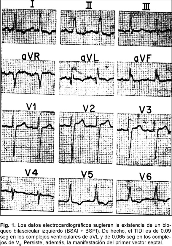 El cuadro electrocardiográfico correspondiente podría hacer pensar en un bloqueo troncular izquierdo de grado intermedio. Sin embargo, la persistente manifestación del primer vector septal, la desigualdad de la prolongación del TIDI entre las derivaciones izquierdas altas y las bajas, los complejos QS en el ventrículo izquierdo y la falta de inversión de las ondas T en derivaciones izquierdas, abogan a favor de un bloqueo periférico.
