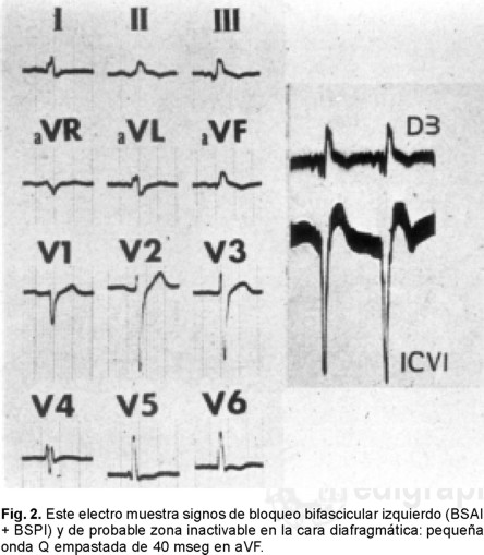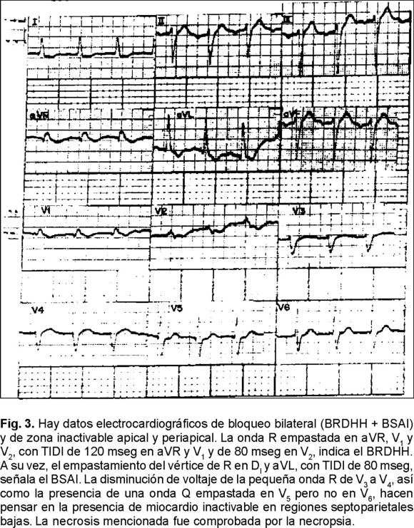 Cuando un bloqueo trifascicular coexiste con una zona inactivable septal, disminuyen las fuerzas iniciales de la activación ventricular, dirigidas hacia adelante y a la derecha. Este cambio se debe al retardo de la manifestación de las fuerzas electromotrices engendradas en la masa septal derecha, y en la zona trabecular del ventrículo derecho, a causa del BRDHH. Se reduce, por ende, el voltaje de las ondas R iniciales en las precordiales derechas. Con frecuencia aparecen ondas Q empastadas y anchas en las derivaciones transicionales V3 y V4 o de V1 a V4. La presencia de ondas Q anormales en dichas derivaciones permite el diagnóstico de la zona inactivable septal complicada con bloqueo trifascicular. Algunos autores, sin embargo, han encontrado ondas Q en las derivaciones V1 a V4 con datos de bloqueo trifascicular aparentemente no asociado a "necrosis" del tabique interventricular.27 En tales casos podrían existir zonas de esclerosis septal o crecimiento de la aurícula derecha, lo que explicaría de manera satisfactoria la presencia de las ondas Q.
