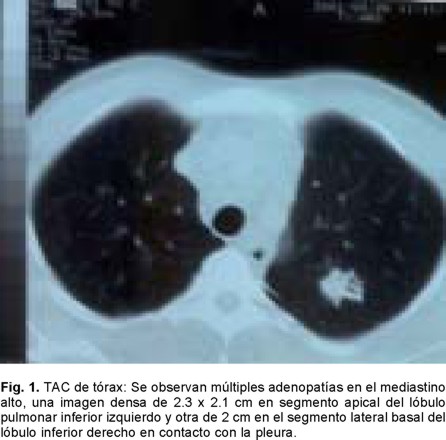 La biopsia de una adenopatía supraclavicular y de tejido pulmonar obtenido por broncofibroscopía, informaron adenocarcinoma semidiferenciado de pulmón. El paciente se negó a la realización de quimioterapia, falleciendo unos días después.