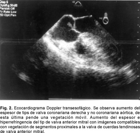 En el ecocardiograma transesofágico (Fig. 2) se observaron imágenes ecodensas compatibles con vegetaciones en las válvulas aórtica y mitral. Los hemocultivos resultaron negativos.