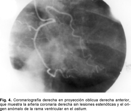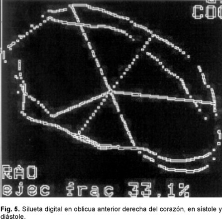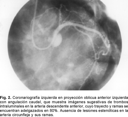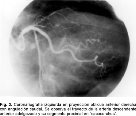 En el gammagrama perfusorio de esfuerzo con Tl201, había datos compatibles con infarto antiguo del miocardio anterolateral e isquemia inferior. La angiografía mostró imagen sugestiva de trombos en el interior de la arteria coronaria descendente anterior, difusamente obstruida en 80% y mal lecho distal (Fig. 2), así como trayecto en sacacorchos o "tirabuzón" (Fig. 3) y arteria coronaria derecha de apariencia normal (Fig. 4). Las lesiones de las arterias coronarias fueron consideradas fuera de la cirugía dado los malos lechos vasculares distales. La ventriculografía izquierda mostró serio deterioro de la función ventricular (fracción de expulsión 0.33). La figura 5 muestra la silueta ventricular izquierda en sístole y diástole.