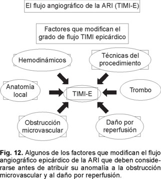 Clásicamente, el flujo coronario es profuso durante la diástole ventricular con caída del mismo durante la sístole cardiaca, donde la microcirculación determina la magnitud del flujo a este nivel por el mecanismo de autorregulación. De existir obstrucción microvascular por embolización (microtrombo plaquetario, detritus de la matriz de la placa) o injuria microvascular por espasmo o daño postreperfusión, la suma del área de la sección transversal del lecho microvascular coronario se encuentra disminuida, lo que a su vez ocasiona reducción de la velocidad del flujo coronario epicárdico. En enfermos infartados con daño microvascular, se ha documentado una disminución de la relación diastólica/sistólica de las velocidades del flujo coronario y también de la reserva coronaria. Así, en sujetos con TIMI E2 y 3 se ha observado: flujo anterógrado sistólico disminuido, flujo anormal sistólico temprano retrógrado y desaceleraciones rápidas de la velocidad del flujo diastólico.172,173