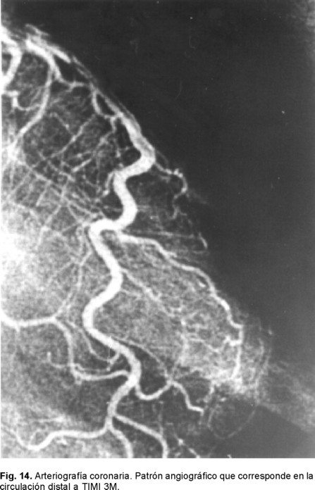 Constituye el grado de flujo coronario que se le ha designado TIMI 3M y que traduce una respuesta que es superior al 95% de flujo coronario normal (Fig. 14). Más recientemente se ha creado otro método angiográfico simple. Los autores lo designan como "sombreado miocárdico" o "TIMI myocardial perfusion blush grade", que evalúa tanto la llegada del material de contraste como su vaciamiento en el miocardio.126,128-130 La valoración de la perfusión miocárdica por este método se cataloga de acuerdo a la siguiente es cala: grado TIMI 0M: sin perfusión miocárdica, TIMI 1M: presencia del sombreado miocárdico pero no eliminación del mismo de la microcirculación, TIMI 2M: sombreado miocárdico pero desaparición muy lenta, TIMI 3M: sombreado en la microvasculatura con lavado y desaparición del contraste en tres ciclos cardíacos. Este método ha permitido una estratificación adicional a la que proporciona el análisis del flujo TIMI epicárdico en relación a la mortalidad. En el estudio TIMI 10 B se obtuvo la siguiente información: con TIMI 3E y TIMI M 0-1: se observó letalidad del 10.9%, con TIMI 3E y M2: del 4.4 % y con TIMI 3E y TIMI 3M la mortalidad fue de tan sólo: 0.7%. 130 Esto claramente traduce que lo relevante de alcanzar "mas allá " del TIMI 3E de perfusión es la óptima irrigación microvascular, o sea el flujo TIMI 4 MIOCARDICO (TIMI 3E +TIMI 3M). Aunque el análisis del flujo angiográfico coronario nos da información valiosa, su profundidad diagnóstica es limitada en relación a la especificidad del método para conocer el verdadero estado de la microcirculación coronaria postreperfusión de la ARI. Al respecto analizaremos otras técnicas o métodos que nos dan más detalles, algunas de naturaleza obligadamente invasiva y otras no intervencionistas, que son las que lucen con mayor aplicabilidad futura en la clínica de esta patología.