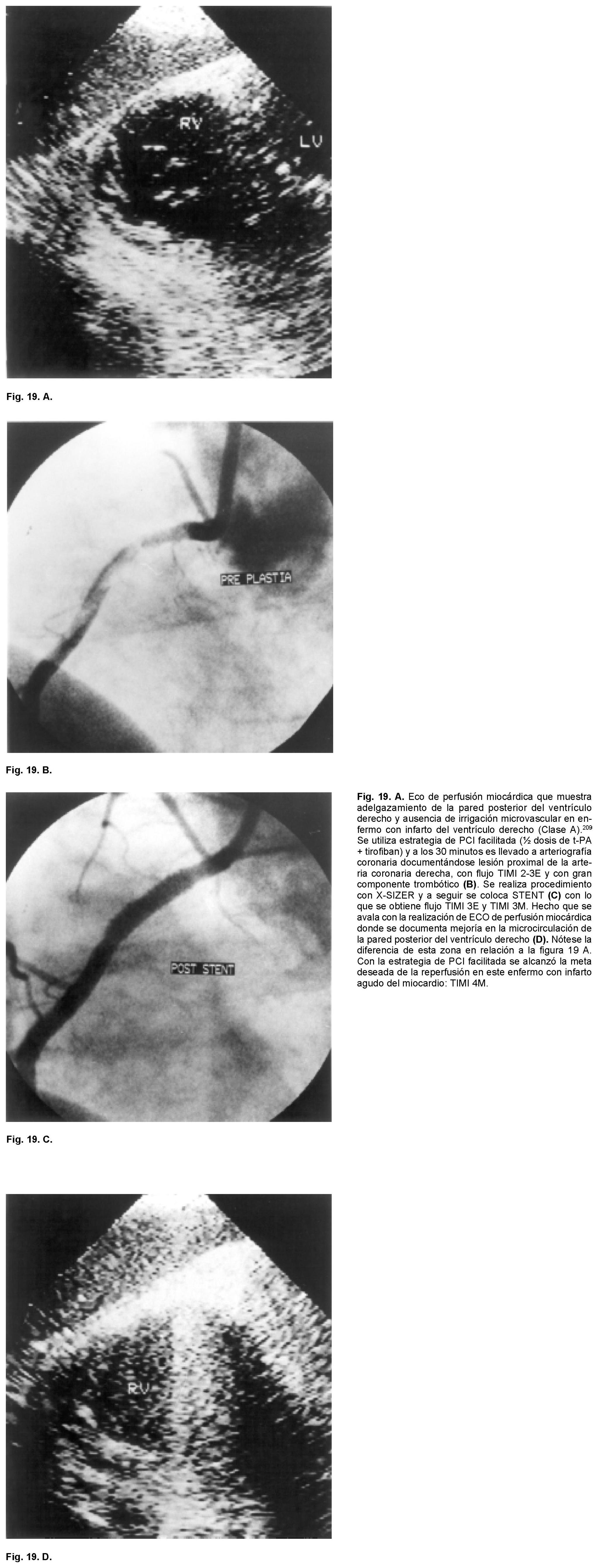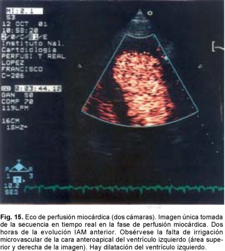 Es una de las técnicas más prometedoras para darnos información acerca del estado de la microcirculación coronaria y para conocer su estado después de haber aplicado un método de reperfusión en la ARI en la práctica clínica hoy día. Los primeros estudios con esta modalidad diagnóstica se realizaron en las salas de cateterismo cardíaco, mediante la infusión intracoronaria de microburbujas de material sonicado, demostrándose defectos perfusorios miocárdicos y por lo tanto el área en riesgo después de la permeabilización de la ARI o bien consignándose la normofuncionalidad del territorio miocárdico.85,176,183,184 Lo relevante es que hoy día es posible obtener estas imágenes a la cabecera del enfermo en un tiempo relativamente corto (Fig. 15). Las observaciones iniciales en este sentido demostraron que existe una estrecha correlación entre el grado de TIMI E y los patrones de perfusión miocárdica obtenidos con la EMC.84,85 En un estudio realizado en 86 enfermos que recibieron dentro de la ventana útil de reperfusión y que alcanzaron TIMI 2E, todos tuvieron patrones de perfusión microcirculatorio anormales con la ECM. En cambio en aquéllos con TIMI 3E se documentaron defectos sólo en el 16%. Este grupo con imágenes anormales aun en presencia de TIMI 3E presentaron función ventricular abatida con poca recuperación a los 28 días y el reestablecimiento de la función ventricular en la clínica fue equiparable al del grupo con IAM y TIMI 2E.183,184 Otras investigaciones ulteriores han corroborado estos hechos documentados inicialmente. La ECM es un método que indica de una manera cuantitativa o global el estado de la perfusión microvascular y puede ser un indicador de la recuperación funcional y clínica del enfermo con IAM. De las diferentes técnicas ecocardiográficas modernas y de las más prometedoras es la ECM con la caracterización ultrasónica del tejido miocárdico en la que se utiliza material sonicado de contraste (microburbujas de perfluorocarbono) inyectadas por vía endovenosa periférica. La caracterización tisular del tejido miocárdico con esta técnica (integrated back-scatter (IBS)) ha sido empleada en el IAM y se ha demostrado que es dependiente del ciclo cardíaco y que la imagen de densitometría acústica está eliminada o atenuada en el tejido miocárdico isquémico o en el infartado al ser comparada con la imagen que da el tejido preservado.185,186 También se ha notado que la recuperación del tejido miocárdico reperfundido con éxito, estudiado en el séptimo día, se asocia a mejoría en la contracción regional, lo que sugiere viabilidad microvascular postreperfusión de la ARI. Takiuchi y coautores187 han confirmado esta observación tan relevante en enfermos con IAM tratados con PCI. Los investigadores consignaron que, en la zona afectada, al tercer día había mejoría de la caracterización ultrasónica del tejido cardíaco, mas sin asociarse con beneficio en los índices de contracción regional ventricular, pero sí notándose efecto favorable a los 21 días de observación. En un trabajo experimental en perros realizado por Leistad y colaboradores,188 en el que efectúan desde la obstrucción completa coronaria a diferentes grados de estenosis de la arteria descendente anterior, los autores demuestran modificaciones en la configuración de las curvas de perfusión de densitometría acústica. Observaron desde ausencia del flujo coronario hasta caídas significativas de la curva de densitometría en relación con el tiempo. El método ha demostrado una buena correlación con el flujo coronario medido con microesferas radioactivas en relación a la imagen de video densitometría (r:0.83, p < 0.0001). Mas esta observación experimental debe aún confirmarse en humanos con cardiopatía isquémica y lesiones coronarias significativas y en aquéllos con obstrucciones de poca cuantía. Estas impresiones sólo se han recabado en grupos reducidos de enfermos y hay que estar conscientes que hay ciertas limitaciones con esta técnica y que aunque los datos ecocardiográficos son fáciles de colectar en manos expertas su análisis es y luce más complicado. La orientación de las fibras miocárdicas profundas y lo distal del campo a explorar afectan significativamente la imagen de la caracterización ultrasónica. En el eje corto el septum interventricular anterior tiene los más altos niveles de caracterización ultrasónica, donde el haz es prácticamente perpendicular a las fibras miocárdicas. En cambio la pared lateral del ventrículo izquierdo y el septum posterior son las que tienen los niveles más bajos, donde la orientación de las fibras miocárdicas es paralela al haz del transductor del ultrasonido. La pared posterior resulta la de menor reflejo acústico por su profundidad. Por lo tanto la anisotropía cardíaca debe ser corregida en esta técnica. Aún con estas limitaciones dadas por la magnitud de la profundidad de las células cardíacas, la orientación de las fibras miocárdicas y las variaciones propias que se han observado en sujetos sanos, la ECM luce relevante. Una comunicación muy reciente de la capacidad de poder determinar el éxito o no de la reperfusión de la ARI, después del empleo del tratamiento fibrinolítico, utilizando la caracterización tisular ultrasónica del miocardio es la información que se desprende del trabajo de Hancock y colaboradores.189 En el estudio de 113 enfermos con IAM sometidos a trombólisis y donde se realizó validación angiográfica del flujo coronario se demostró que utilizando la diferencia en los picos de la caracterización ultrasónica (integrated back-sacatter (IBS) ) del miocardio anormal y sin ARI permeable vs el tejido infartado, mas reperfundido, que el IBS era mucho más bajo en la zona infartada y no irrigado o con arteria ocluida postfibrinólisis, que la del tejido que sí fue reperfundido con éxito postrombólisis (3 .3 vs 4.6 dB, p < 0.00001). Los autore