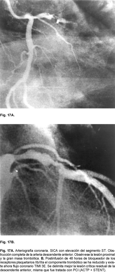 Con toda la evidencia experimental y la clínica mencionada previamente de la patofisiología de la cardiopatía isquémica aguda, queda poca duda de que en el tratamiento moderno de los síndromes coronarios agudos con o sin elevación del segmento ST, es muy relevante enfocar nuestra atención terapéutica a la microcirculación coronaria. Esto amén de la ya establecida y sustentada sobre la importancia de obtener permeabilidad óptima de la arteria epicárdica. La investigación sobre el tratamiento del fenómeno de microembolia plaquetaria vinculado a la obstrucción microvascular con terapia antiplaquetaria ha dado resultados sólo prometedores. En cambio para aquéllas encaminadas hacia la corrección de la injuria postreperfusión los resultados parecen mucho más alentadores en el terreno experimental, mas lamentablemente ésta no lo es en el escenario clínico. Los ensayos con inhibidores de los receptores de la glucoproteína plaquetaria IIb/IIIa realizados in vitro e in vivo, han apuntado que con su utilización es posible mejorar la disfunción microvascular producto de la microembolización plaquetaria. Se ha demostrado que con su empleo se reduce la masa del trombo epicárdico y la plataforma para la generación de trombina, se favorece la penetración del trombolítico, se disminuyen los inhibidores de la trombólisis (alfa 2 inhibidor plasmático y PAI -1) e inhiben los receptores plaquetarios IIb/IIIa con lo que se impide la agregación de estos elementos formes de la sangre al reducir además la viscosidad de las mismas. Con el uso de ellos se ha visto que los agregados plaquetarios constituidos son más débiles que cuando se administra placebo o sólo heparina, lo que limita la agregación y dan mayor exposición a la fibrina, por lo tanto favorecen la acción de los fibrinolíticos exógenos. De manera sucinta podemos decir que, además de favorecer la permeabilidad de la arteria epicárdica, estos agentes actuarían distalmente en la microcirculación evitando la microembolización y la trombosis (Figs. 17 A y B).190 Con esta medicación se ha consolidado el concepto que se favorecen con mayor frecuencia flujos TIMI 3E a los 90 minutos. Así ha quedado demostrado, al comparar estrategias de fibrinolíticos o de la ACPT sola, y cuando se ha empleado además el inhibidor del receptor plaquetario. En diferentes megaestudios utilizando abciximab, tirofiban o eptifibatide como son: el TIMI-14, el PAMI, el PAMISTENT, el CADILLAC, el GUSTO V, el ADMIRAL y el ASSENT 3 se han logrado obtener en promedio flujos coronarios TIMI 3E en el 90-95% en los enfermos a los 90 minutos.147,148,190 Con esta mejoría del flujo coronario epicárdico se esperaría un gran beneficio en reducir la mortalidad del IAM. Se ha demostrado con abciximab en el estudio ADMIRAL una reducción de puntos cardiovasculares adversos hasta del 80% a los 30 días comparado con el grupo control (p < 0.031).151 También se han colectado datos que permiten afirmar que existe menor trombosis de la ARI, del stent y se favorece la función ventricular. Si estas mejorías en el flujo epicárdico coronario es mediada directamente por la inhibición de la agregación plaquetaria o por el reestablecimiento más rápido de la permeabilidad de la ARI o por beneficio directo en la microcirculación coronaria aún está por establecerse en la clínica. Lo importante a consignar es que el impacto que se esperaba que darían al utilizarlos de manera asociada con la fibrinólisis o los PCI, permitía pronosticar una reducción cercana al 2% en mortalidad del IAM, condición que no se ha alcanzado en los estudios antes citados a pesar de haberse incrementado la tasa de reperfusión de la ARI en un 20- 25%.147,148,151,190 Deseamos recordar que hay otras observaciones clínicas, como aquellas que documentan flujos TIMI 3E + TIMI 3M, con mortalidad cercana al 1.5% para el IAM. En el estudio GUSTO II b sólo con ACTP sin bloqueador del receptor plaquetario, se alcanzó una mortalidad del 1.6% con TIMI 3E. En cambio en el estudio CADILLAC en enfermos con IMA, que en un 88% estaban en clase Killip-Kimball I, la mortalidad con ACTP + abciximab fue de 2.5% y con stent + abciximab del 4.2% a los seis meses.147, 148 En el estudio GUSTO V (fibrinólisis + abciximab), la mortalidad global fue del 6%, aunque es de mencionar que ha sido una de las letalidades más bajas documentadas en la historia del IAM con terapia trombolítica. Mortalidades similares se han documentado en el estudio ASSENT-3, donde se utilizaron como estrategias para el tratamiento del IAM: tenecteplase con enoxaparina (5.4%), asociada a abxicimab (6.6%) y con heparina no fraccionada (6.0%).150 Aunque recordaremos que cuando se utiliza esta modalidad de reperfusión y se alcanza TIMI 3E, la mortalidad que se ha anotado es del 4.4%. Otra observación importante es la que se deriva del metaanálisis de estos medicamentos en los SICA sin elevación del ST, donde éstos han logrado abatir 1% la mortalidad de manera absoluta.143 Además demuestran claro beneficio en los enfermos diabéticos, sean enviados o no a procedimientos de reperfusión mecánica. En cambio al realizar el análisis del grupo de diabéticos con IAM, los bloqueadores de los receptores plaquetarios o no tienen efecto o resultan deletéreos. Así ha quedado documentado en el GUSTO V y en el ASSENT 3.148,150 Lamentablemente se tiene que decir que aparentemente aunque hay claro beneficio con el empleo de bloqueadores de los receptores plaquetarios en la arteria epicárdica, no se ha logrado demostrar que lo mismo acontece con su utilización a nivel de la perfusión microvascular en el IAM (Figs. 17 A y B). Otros caminos se han trazado para resolver la problemática de la microembolización por medio de dispositivos mecánicos de aspiración o con el uso concomitante de filtros o cestillas, instrumentos hemodinámicos que hoy día están en plena evaluación clínica. El catéter de trombectomía X-sizer s