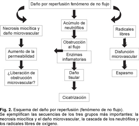 Verdaderos avances existen de esta causal de la pérdida del flujo normal microcirculatorio coronario, mismas que se han fundamentado en las observaciones experimentales relacionadas con la activación y el acúmulo de neutrófilos y con los ensayos al depletarlos. También con los conocimientos adquiridos acerca de la activación del complemento, de la actividad de las selectinas e integrelinas CD 11b y CD 18 y los estudios concernientes a la generación y liberación de radicales de oxígeno (Fig. 2).32