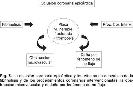 Para los SICA con elevación del segmento ST la estrategia terapéutica que ha dado la mayor reducción de la mortalidad en las últimas dos décadas ha sido, sin lugar a duda, la reperfusión exitosa de la arteria responsable del infarto (ARI).10 Sin ignorar el impacto favorable que han tenido también la aspirina, los betabloqueantes, la heparina, los inhibidores de la enzima convertidora de angiotensina y más recientemente las estatinas en la prevención secundaria en la cardiopatía isquémica.11,12 Reciente es el cambio en el pensamiento en el orden terapéutico de además de contemplar la importancia que tiene alcanzar la permeabilidad óptima de la ARI y conservar su flujo, que exista la mejor perfusión en el miocardio y de limitar el daño de la reperfusión.13,14 Por lo que esta revisión se centrará fundamentalmente sobre estos aspectos tan novedosos de la cardiología contemporánea en especial los vinculados a la microembolización y al fenómeno de no flujo postperfusión a nivel del miocardio.