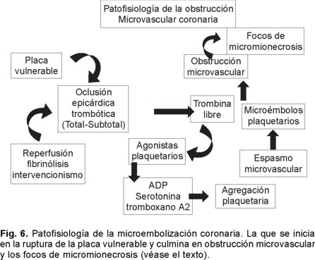 El concepto de la microembolización no es realmente nuevo o al menos el de la participación de la microvasculatura en la circulación coronaria. El-Maraghi y Genton E113 describen en un artículo que se debe considerar clásico, la frecuencia de estas anomalías en un grupo de enfermos con diferentes patologías cardiovasculares y hacen patente la relevancia de la tromboembolia de la fibrina y del material plaquetario y su relación con la muerte súbita. Encontraron involucro de daño microvascular en 19/162 enfermos con cardiopatía isquémica y en seis de 47 sujetos sometidos a cirugía cardíaca, describiendo trombosis microvascular, miocitólisis focal y lesiones miofibrilares. En ellos destaca la importancia de estas alteraciones patológicas en la cardiopatía isquémica y es de hacerse notar que lo hacen tanto para el ventrículo izquierdo como para el derecho. Es por estas mismas fechas cuando a partir de los trabajos de Folts y colaboradores y de Willerson y coautores quienes utilizaron un modelo experimental de injuria endotelial coronaria, se empieza a destacar la importancia de las microembolias, particularmente las de origen plaquetario.114-117 Con el pasar del tiempo la patofisiología de la microembolización coronaria se ha puntualizado y se puede consignar de la siguiente manera (Fig. 6) A partir de una placa ateroesclerosa vulnerable que por lo general dará menos del 60% de obstrucción del lumen coronario, puede perder su estabilidad y entrar en actividad.118 Misma que en esta época moderna pudiera eventualmente identificarse en la clínica por estudios de resonancia magnética nuclear.119 Sin embargo, por lo general la actividad y la fractura de las mismas se traduce en un evento clínico (SICA con o sin elevación del segmento ST). A partir de la erosión o la ruptura de la misma da como consecuencia obstrucción completa (trombo rojo, con predominio de glóbulos rojos sobre las plaquetas) por períodos de 6 - 8 horas en el 80% de los enfermos y ocasiona IAM o bien da una trombosis suboclusiva (trombo blanco: rico en plaquetas) ocasionando los síndromes de angina inestable o de infarto no Q. Mismos en los que es relevante consignar que también pueden tener períodos transitorios de oclusión coronaria total que se han documentado del 20 - 40% de los enfermos y que duran habitualmente menos de una hora.119,120 Recientemente Lindhal y colaboradores han realizado un estudio muy importante en el cual correlacionan la determinación cuantitativa de troponina I, la magnitud de lesiones coronarias significativas y la presencia de trombos.5 Los autores consignan que las lesiones coronarias no significativas son rara vez observadas o están ausentes con troponinas positivas. Lo frecuente es documentar obstrucciones bi o trivasculares importantes y lo más trascendente es observar trombosis de las arterias coronarias alrededor del 30% dentro de la primera semana y con mayor incidencia a medida que avanzan los días. Substrato que sugiere o da mayor posibilidad de microembolización repetida durante este período de actividad de la placa aterosclerosa en los SICA sin elevación del ST. Lo importante al tema es que ambas lesiones pueden ser embolígenas a la microcirculación coronaria. Máxime que se sabe que todo este proceso no es explosivo - estático, por el contrario es agudo y muy dinámico, en donde el binomio trombosis - fibrinólisis endógena es lo que predomina dando grados diferentes de obstrucción epicárdica coronaria que se traducen en el ámbito experimental en variaciones cíclicas del flujo coronario y que tienen en la clínica la expresión de episodios de angor de duración variable y habitualmente con alteraciones en el ECG de superficie. La patofisiología de la obstrucción microvascular (OMV) tiene su origen en este primer escenario a partir de la obstrucción total o subtotal de la arteria epicárdica responsable del infarto. Se ha validado que estos fenómenos también pueden ser producto de la manipulación endovascular por los PCI tales como: la angioplastía con balón, la colocación de mallas endovasculares (stents) y la rotaablación endocoronaria, pero también recordemos que puede resultar por algo más común, la acción fibrinolítica exógena (la terapia trombolítica) (Figs. 5 y 6).121,122 Se ha demostrado que en este escenario clínico tan dinámico en donde se deja trombina libre se incrementan en la circulación coronaria en cuestión de segundos o minutos productos tales como el ADP, la serotonina, el tromboxano A2 o su metabolito el tromboxano B. Todos ellos son capaces de favorecer u ocasionar vasoespasmo y los fenómenos de adhesión - agregación plaquetaria dando origen a la formación de microtrombos ricos en receptores de glucoproteínas IIb/IIIa, lo que confirma la importancia de esta estructura tromboembolígena en la génesis de lo que finalmente da focos de micromionecrosis. Es una alteración histológica que se ha documentado hasta en el 40-50% de los materiales estudiados. Es de mencionarse también que junto con el material plaquetario es posible que se acompañe del contenido de partículas la matriz de la placa ateromatosa rota. Existe incremento de las células endoteliales en la sangre periférica de sujetos con SICA al ser comparados con aquellos que tienen SIC crónicos o sólo angina de esfuerzo. En modelos experimentales Eguchi y colaboradores123 han demostrado la pérdida de la integridad a la adhesión plaquetaria, además de lo comentado referente a las plaquetas y los leucocitos. Por lo tanto, es factible que los constituyentes de la placa, de la matriz y las células endoteliales puedan ser embolizadas. Independientemente del daño descrito con antelación, el efecto en la clínica o el panorama parece poder resumirse: en presencia de microinfartos y desarrollo de arritmias potencialmente malignas capaces de dar muerte súbita.108,113 Además hay reducción de la reserva coronaria, disfunción zonal d