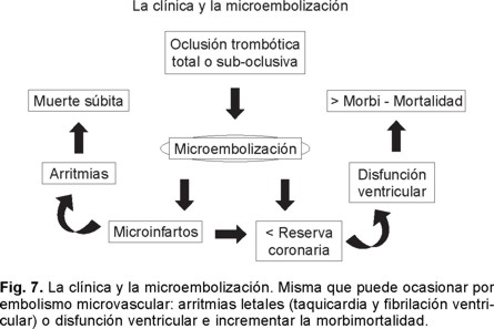 Existen trabajos de la última década que han marcado la trascendencia que tiene la microembolización en esta patología en sus etapas de agudización.106-110 Mas sólo es reciente la posibilidad de documentarla en la clínica, gracias a los avances tecnológicos modernos, particularmente los vinculados a la imagenología cardiovascular. Lo que incluye: la resonancia magnética nuclear, la ecocardiografía miocárdica contrastada, y también con los novedosos estudios de medicina nuclear. Mediante esta tecnología en una proporción significativa o no despreciable de enfermos se ha documentado obstrucción microvascular. Más aún lo más trascendente desde el punto de vista clínico es que esta micropatología vascular se ha ligado a evolución no favorable e incremento en la mortalidad. Ligada a esta valiosa observación también se han buscado nuevos caminos terapéuticos para contrarrestarla y con ellos se ha demostrado que es posible abatir la morbilidad y posiblemente la mortalidad que resulta de la microembolización en algunos de los escenarios agudos de la cardiopatía isquémica.