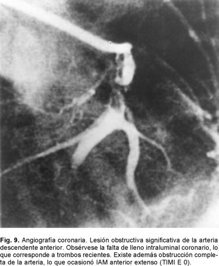 Sabemos que hace 70 años la mortalidad del IAM era cercana al 40%, misma que se logró reducir al 25% a principios de 1951 con la simple maniobra de la movilización temprana y al 20% con la creación de las Unidades Coronarias en 1973. Es en 1987, con la introducción de la terapia fibrinolítica que se establece un nuevo descenso para considerarse cercana al 8%. Ya perfeccionada la terapia de reperfusión y con la introducción de los PCI (angioplastía con balón y mallas endovasculares coronarias) es que tenemos un resultado que oscila del 4 al 6% de mortalidad del IAM (Fig. 10). Es por eso que hoy día se acepta que esta modalidad terapéutica es la que ha sido capaz de brindar el más importante descenso de la mortalidad en el rubro del IAM transmural. Entre los factores más importantes de los que depende alcanzar esta reducción está el factor tiempo relacionado al momento en el que se de el tratamiento o ventana terapéutica en la que se aplique la terapia de reperfusión. La magnitud de miocardio salvado determinada experimentalmente para el ventrículo izquierdo es cercano al 70% si la reperfusión se realiza en la primera hora a partir de haberse ocluido la arteria epicárdica. Disminuye al 40% a la tercera y al 20% a la sexta, para ser menor del 5% a las 24 horas. Para el ventrículo derecho Lester y colaboradores124 han encontrado que el área de infarto a la hora de reperfusión es de tan sólo un cinco por ciento, a las cuatro horas es de un 10% y a las ocho es del 20%. Por lo tanto, el acortar el tiempo de la reperfusión para cualquiera de ambas cámaras ventriculares sería igual a menor daño miocárdico o mayor magnitud de miocardio salvado. Esta es una de las razones por la que después de seis horas el beneficio de la reperfusión de la arteria epicárdica decae significativamente para considerarla casi nula después de doce horas. Lo que se aplica tanto para el tratamiento fibrinolítico como para los PCI. Si en la ARI no se obtiene permeabilidad inmediata la mortalidad es del 17.5%, lo que equivale a remontarnos a la consignada en los años de 1970. Si la ARI está permeable a los 90 minutos pero se le encuentra ocluida al séptimo día, la mortalidad es del 12% lo cual nos ubica en la mortalidad documentada a principios de 1980. Si la ARI está permeable a los 90 minutos y al séptimo día la mortalidad es del 4.7%. Por otro lado, la importancia de la calidad del flujo epicárdico post reperfusión resulta extraordinariamente relevante. Las primeras observaciones en este sentido con la terapia de reperfusión lítica nos demostraron que cuando el flujo epicárdico es TIMI: 0 -1 la mortalidad del IAM es del 8.9%, al ser grado TIMI: 2 la mortalidad es del 7.4% y con TIMI: 3 epicárdico es del 4.4% (Figs. 8 y 11 A - 11 B). Pero por fortuna hemos avanzado en el conocimiento en este sentido y con la valiosa información del estudio GUSTO II b (The Global Use of Strategies to open Occluded Coronary Arteries in Acute Coronary Syndromes) sabemos que con ACTP de obtenerse flujo TIMI 0-1-2 la mortalidad es del 18 - 20%, cifras que resultan casi del doble de las documentadas con trombólisis para los mismos flujos, hecho interesante que nunca se ha explicado claramente.125 En cambio de obtenerse flujo TIMI 3E la mortalidad a treinta días es de tan sólo 1.6%, observándose menor tamaño del área infartada y mayor índice de miocardio salvado. Lo que establece sólo una diferencia del 2.8% entre las dos estrategias de reperfusión cuando se alcanzan flujos TIMI 3E (Fig. 8). Para llegar a estas conclusiones, frente a los enfermos es menester tomar en consideración los datos relevantes proporcionados por Gibson y colaboradores en relación al análisis angiográfico de la perfusión miocárdica.126 Mismo que se ha valorado por dos métodos pero que al final sólo traducen que existe perfusión a nivel de la microvasculatura. Empero hay que recordar que existen varios factores de los que también depende el flujo TIMI epicárdico como son los de orden: hemodinámico, la anatomía local de la arteria, la propia técnica del procedimiento, el trombo intracoronario y aspectos derivados del intervencionismo: la estenosis residual, la disección involuntaria de la arteria coronaria y menos relevantes parecen la aplicación de las mallas endocoronarias (Fig. 12).126 Excluidas estas causales, quedarían las dos más importantes a considerar: la obstrucción microvascular y las que son producto del fenómeno de no flujo en la microcirculación. El flujo TIMI en la microcirculación se expresa o se visualiza en la angiografía coronaria como áreas de condensación de aspecto esmerilado muy finas del material de contraste a nivel del miocardio. Esto es lo que los autores anglosajones designan en su lengua como "blush" y que correspondería a "TIMI miocárdico 4".127-130 Si bien las anomalías de la microcirculación se han demostrado de manera fehaciente por los diferentes métodos citados con antelación, si se cuestiona si lo que documentamos es también producto de edema miocárdico y/o del daño por reperfusión. Sin embargo este patrón de alteración microcirculatoria ocurre tempranamente (en las primeras horas o días), lo que hace menos probable que sea por daño por reperfusión. Es más, se le ha documentado en sujetos que van a PCI (rotaablación coronaria) y tras la práctica de ellos aparecen cambios miocárdicos en los estudios de perfusión nuclear, lo que sugiere embolización a la microcirculación (Fig. 13). 121,122 Con la utilización de catéteres con redes o sistemas de aspiración se han recuperado fragmentos del material que hubiesen sido embolizados. Por lo tanto, en la clínica se puede decir que este mecanismo se sugiere como la causa primordial, al menos en etapas tempranas, de las anomalías documentadas en la microcirculación. Mas es innegable que en el caso de IAM transmural reperfundido deberán estar presentes los dos mecanismos, el inicial ligado 