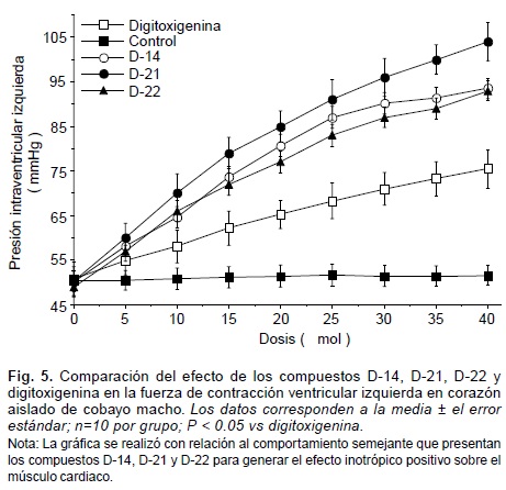 En la preparación de Langendorff, los derivados sintéticos -OH (digitoxigenina deshidroxilada por sustitución de un átomo de hidrógeno en la posición 14), -Lac (digitoxigenina deslactonada por sustitución de un átomo de hidrógeno en la posición 17), D-01, D-02 y D-03, presentaron, en comparación con la digitoxigenina, un menor efecto inotrópico positivo (Figs. 2 y 3). En contraste, los compuestos D-07, D-14, D-15, D-20, D-21 y D-22, denotaron un efecto inotrópico positivo mayor que el de la digitoxigenina (Figs. 4 y 5).