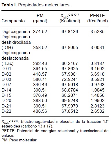Se diseñaron los prototipos con base a los estudios cualitativos de relación estructura-actividad reportados por Deghenghi,12 Pastelín,13 Wiesner14 y García-Domenech.15 La digitoxigenina fue seleccionada como precursor estructural digitálico, debido a la factibilidad que presenta para realizar directamente en la molécula, modificaciones estructurales a nivel de reactividad química selectiva. Así, se sintetizaron once compuestos los cuales denominamos -OH, -Lac, D-01, D-02, D-03, D-07, D-14, D-15, D-20, D-21 y D-22. Su estructura química se verificó mediante reactividad química específica, con base a las metodologías funcionales de Feigl,16 Tatsime-Ohi,17 Shriner,18 Castellanos19 y Siggia.20 Los acoplamientos se ratificaron por resonancia magnética nuclear.21-23 La electronegatividad y los potenciales de energía rotacional y de energía translacional de enlace, fueron evaluados por el método Duhamm bajo radiación infrarroja.11,21,24
