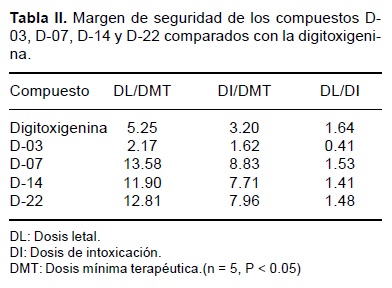 Hasta el momento, en el modelo cardiopulmonar de Starling, los compuestos D-07, D-14 y D-22, revirtieron por completo la insuficiencia cardiaca experimental, mientras que el derivado D-03, resultó poco activo para revertir la insuficiencia (Fig. 6). El margen de seguridad de los compuestos D-07, D-14 y D-22, a juzgar por los cocientes DL/DMT y DI/DMT, fue más amplio que el de la digitoxigenina, en tanto que para el D-03, resultó mucho menor que el observado para el precursor (Tabla II). El índice toxicológico de los compuestos D-07, D-14 y D-22 no mostraron diferencias significativas con respecto al de la digitoxigenina; pero el compuesto D-03, resultó de mayor toxicidad.