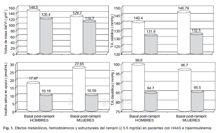 El ramipril a dosis de 2.5 a 5 mg/día en una sola toma, produce una mayor disminución de las cifras de tensión arterial sistólica y diastólica en los pacientes con hiperinsulinemia en comparación a lo reportado para la población hipertensa general. Produce una disminución significativa de los valores basales de insulina y de la relación glucosa/insulina, así como una regresión de la hipertrofia ventricular izquierda al producir una disminución significativa del espesor del septum, de la pared posterior del VI y del índice de masa ventricular izquierda.