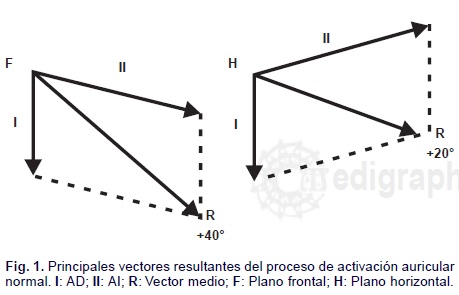 El fenómeno de la despolarización de la aurícula izquierda puede resumirse en un vector resultante que se dirige hacia la izquierda, atrás y discretamente abajo: segundo vector de la activación auricular, que se manifiesta a los 80-90 mseg después del comienzo de dicho fenómeno. La suma vectorial de los vectores resultantes derecho e izquierdo da origen al vector medio de la activación auricular, el cual se orienta hacia la izquierda, abajo y ligeramente adelante; alrededor de + 40° en el plano frontal y de + 20° en el horizontal. Las fuerzas electromotrices auriculares se reflejan en la onda P, cuyo eje medio se sitúa alrededor de + 45° en el plano frontal (ÂPF) y de + 20° en el horizontal (ÂPH). Por eso la onda P normal es negativa en aVR y positiva en las derivaciones bajas aVF, DII y DIII, así como en las precordiales izquierdas y en la unipolar del hipocondrio izquierdo (MI).