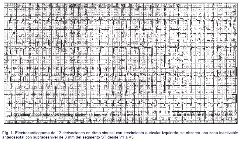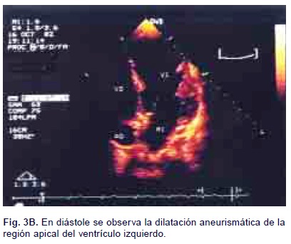 Femenino de 76 años de edad con historia de tabaquismo importante crónico. A los 61 años de edad tuvo un infarto del miocardio de localización anterior extensa que no recibió tratamiento de reperfusión y que evolucionó hacia la disfunción ventricular izquierda crónica. Fue hospitalizada por un evento de isquemia cerebral transitoria. A su llegada se encontró en el electrocardiograma (Fig. 1) una zona inactivable anterior extensa correspondiente al infarto antiguo con elevación del segmento ST de 3 mm en derivaciones precordiales V1 a V5 que despertaron la sospecha de reinfarto anteroseptal. La radiografía portátil de tórax (Fig. 2) mostró una imagen bien delimitada de calcificación dentro de la silueta cardiaca. La aproximación apical de 4 cámaras del ecocardiograma evidenció un aneurisma verdadero anteroapical con discinesia durante la sístole (Fig. 3A) y aumento del tamaño de la cavidad durante la diástole (Fig. 3B); en estas imágenes se observaron áreas de hiperreflectancia anteroapical que corresponden a zonas de calcificación de la pared aneurismática.