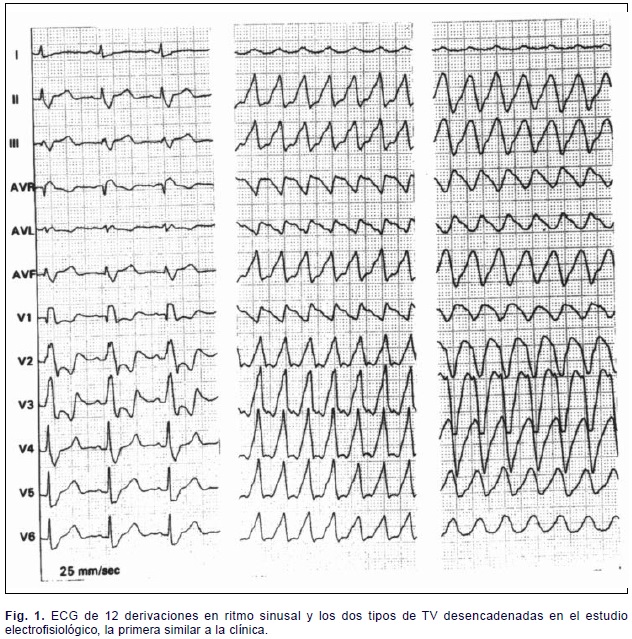Mujer de 36 años de edad con TF e historia de cirugía paliativa (anastomosis pulmonar tipo Waterston-Cooley) a los 5 años de edad y corrección quirúrgica completa a los 6 años de edad. Presentó palpitaciones en agosto de 2001, por lo que acudió a su centro médico donde se documentó taquicardia ventricular (TV) con una frecuencia de 202 latidos por minuto (lpm) con imagen de bloqueo de rama derecha del Haz de His (BRDHH) y eje superior (Fig. 1). Se administró amiodarona por vía intravenosa (5 mg/kg) en bolo sin terminar el episodio de TV, por lo que requirió de cardioversión eléctrica. El electrocardiograma (ECG) en ritmo sinusal mostró bloqueo de rama derecha del Haz de His de grado avanzado. un ecocardiograma mostró tronco pulmonar hipoplásico con gradiente pulmonar de 7.3 mm Hg, comunicación intraventricular restrictiva y ventrículo derecho dilatado (diámetro telediastólico de 41 mm) con función ventricular izquierda conservada.