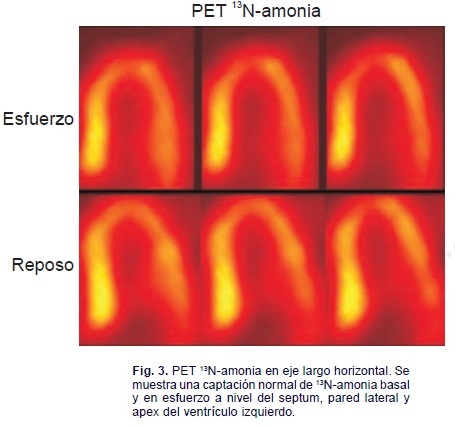 Se estudió con un protocolo reposo-estrés con dipiridamol. Se administraron 20mCi de 13N-amonia para la fase de reposo con el paciente ya posicionado bajo la cámara PET, iniciando la adquisición de la imagen en forma inmediata durante 19 minutos. Posteriormente se administró dipiridamol a dosis de 0.56 mg/kg/min por cuatro minutos, inyectando 30m Cide 13N-amonia al séptimo minuto, con un tiempo de adquisición de 19 minutos.