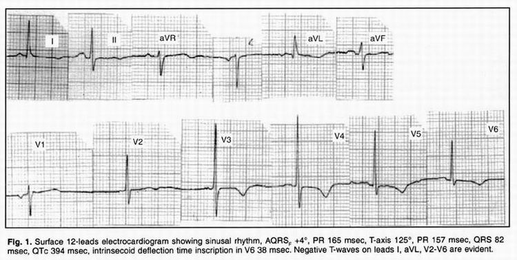 A 78 year-old woman was admitted to our institution due to 2-months history of typical angina both at rest and on exertion. She had a 10 years history of arterial hypertension and hypercholesterolemia. Physical examination revealed normal first and second heart sound without murmurs. Her blood pressure was 130/80 mm Hg. No signs of heart failure were observed. The electrocardiogram showed sinus rhythm, 65 beats per minute, with AQRS F +4°, PR 165 msec and negative T-waves in leads I, aVL and V2-V6 (Fig. 1) . Chest x-ray appeared normal. A transthoracic echocardiogram showed normal left ventricular wall motion with normal wall thickness