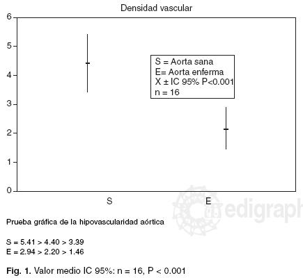 El resultado obtenido muestra disminución de la densidad vascular de la pared de aorta enferma de aterosclerosis comparada con la de porciones sanas aledañas. Hay menor cantidad de vasa vasorum en donde la capa íntima se ha engrosado y la media se ha adelgazado por separación y migración de células musculares. Esta disminución de la cantidad de vasa vasorum es real porque se confirma al comparar número de vasos con longitud de los segmentos arteriales estudiados.